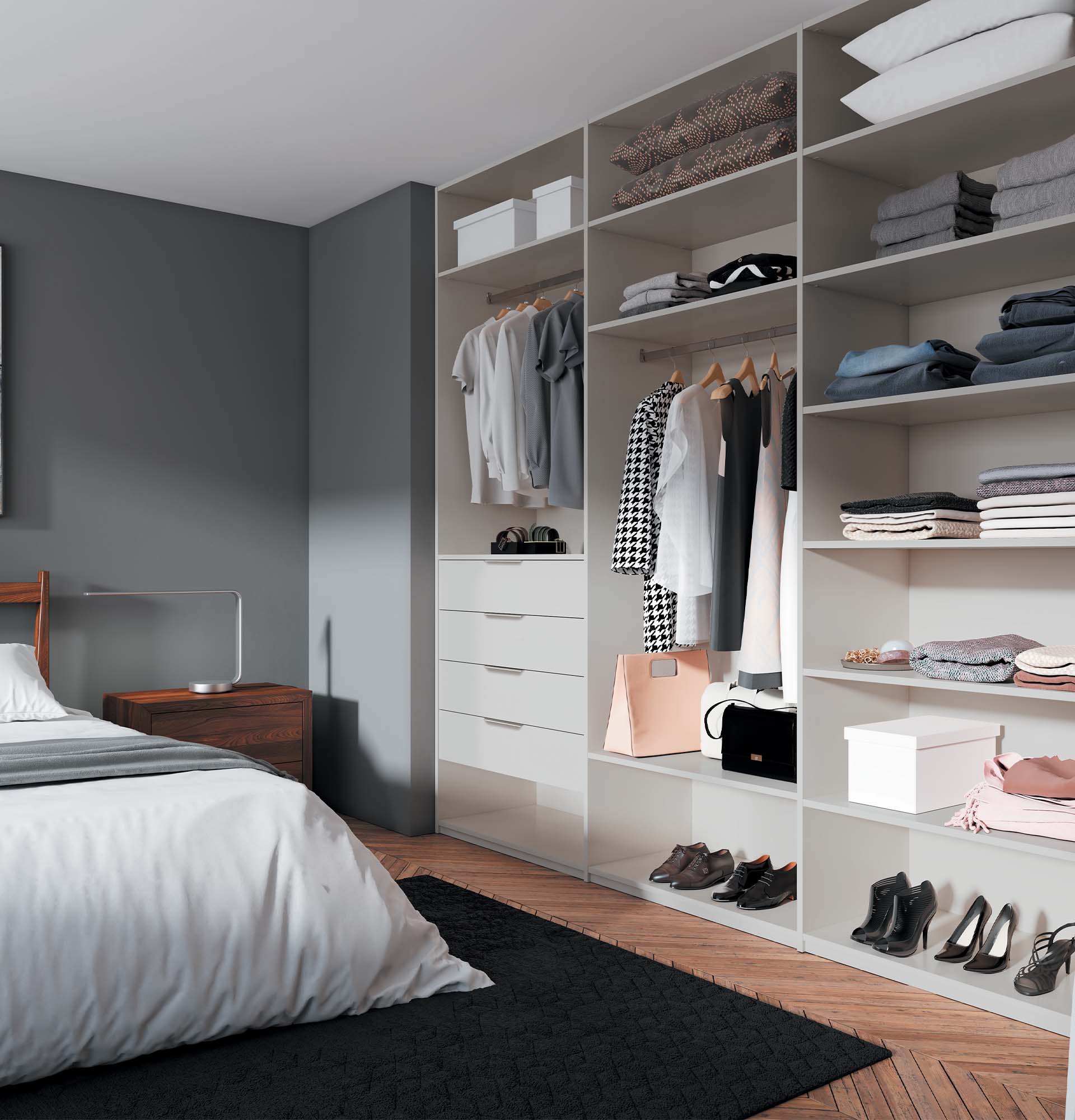 • Dans le cas d'un rangement fermé par des portes coulissantes, prendre en considération le recouvrement des vantaux pour ne pas gêner l'ouverture des tiroirs, de la penderie télescopique et des porte-pantalons.
