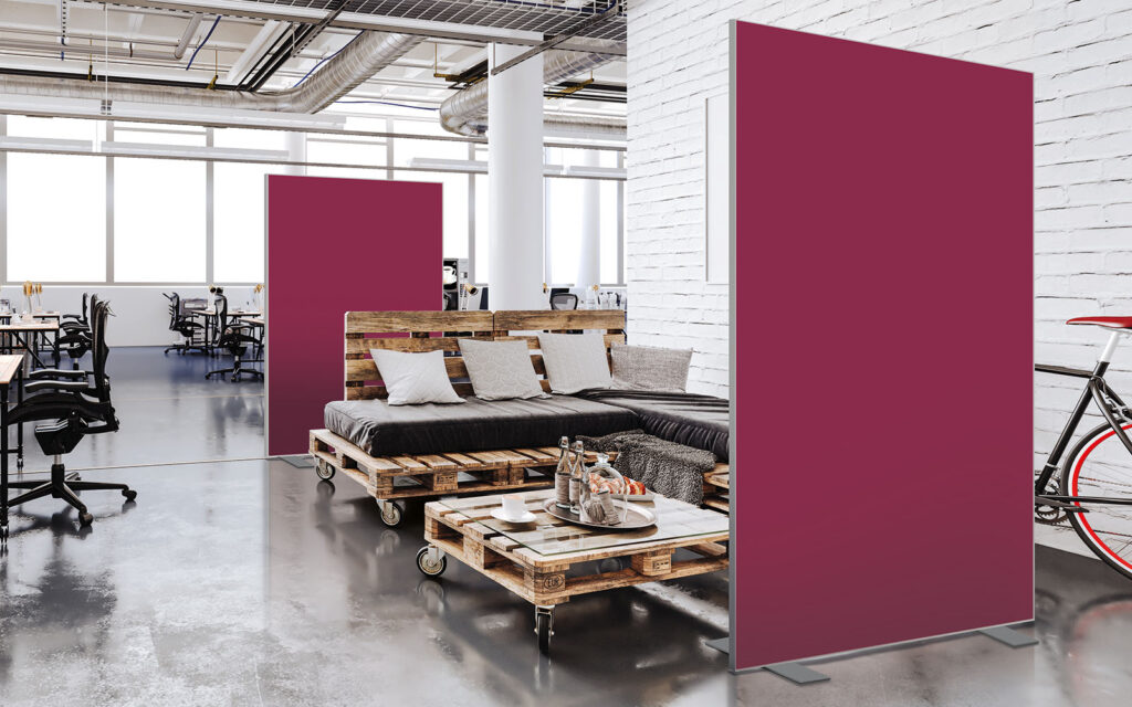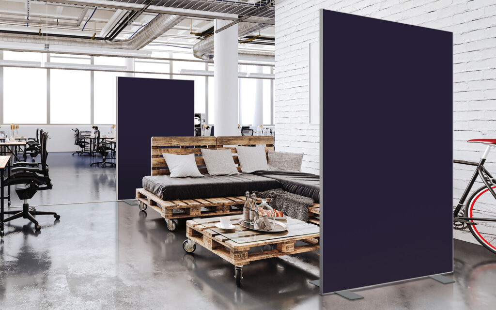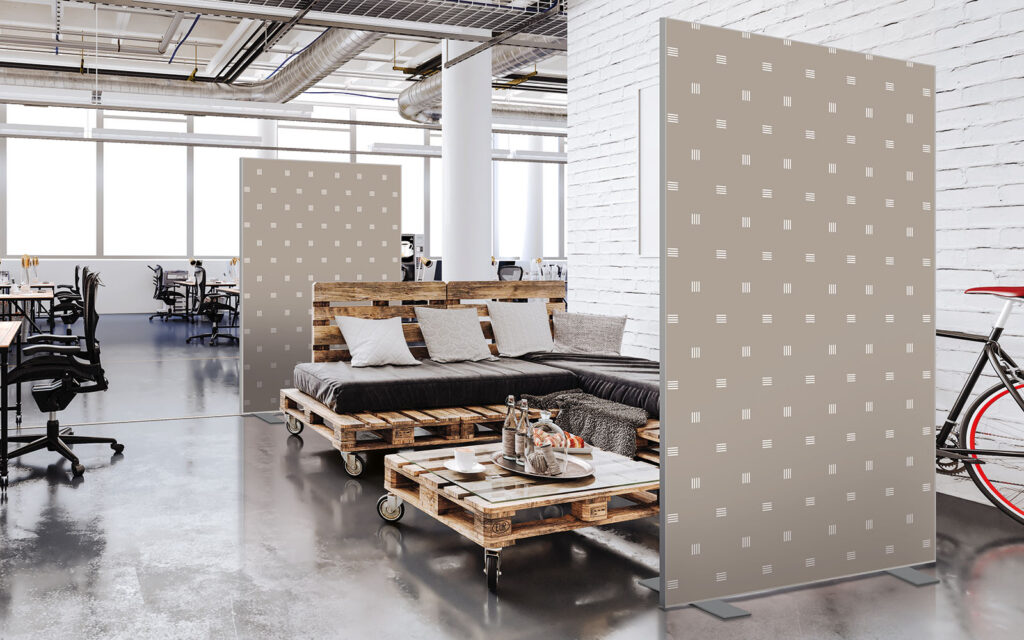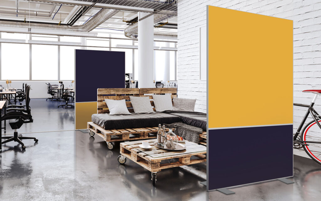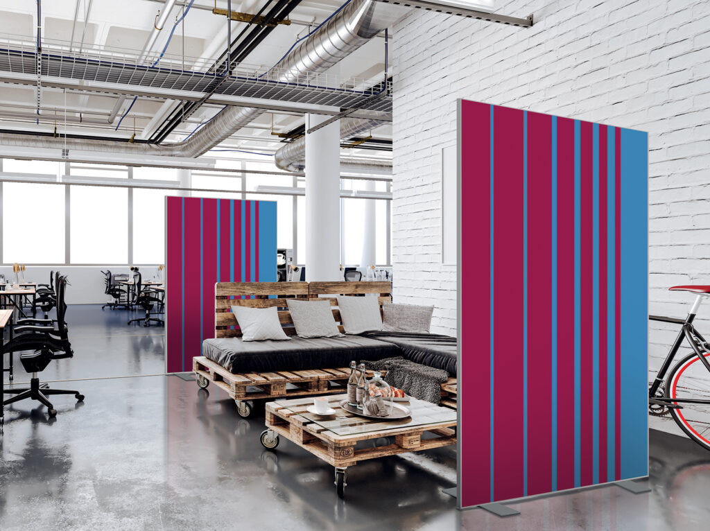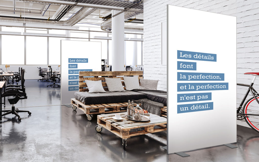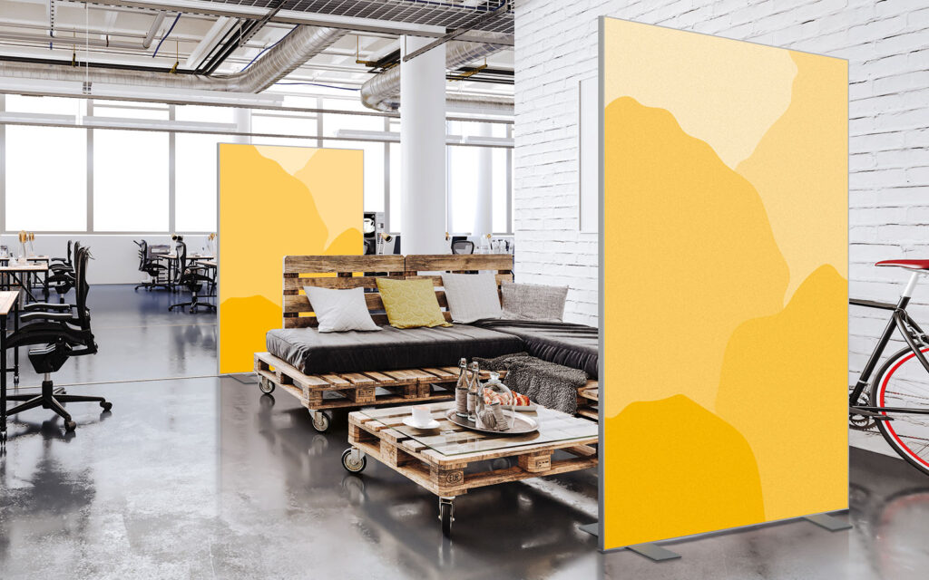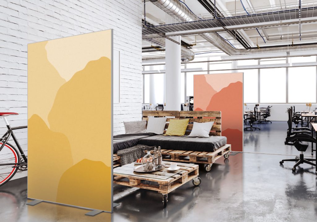 Les cloisons amovibles sont idéales pour séparer et moduler les espaces et, parce qu'elles profitent de toute la gamme de toiles Imago, elles apportent une touche décorative forte. En version sur pied, elles se déplacent partout pour répondre aux besoins. Sur vérins, installées du sol au plafond, elles marquent clairement les espaces. De plus, grâce à leur mousse acoustique intégrée, elles contribuent à réduire les nuisances sonores.