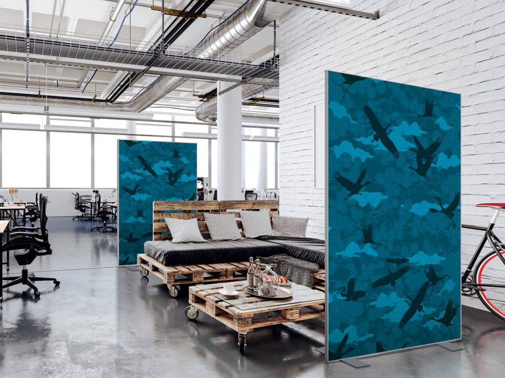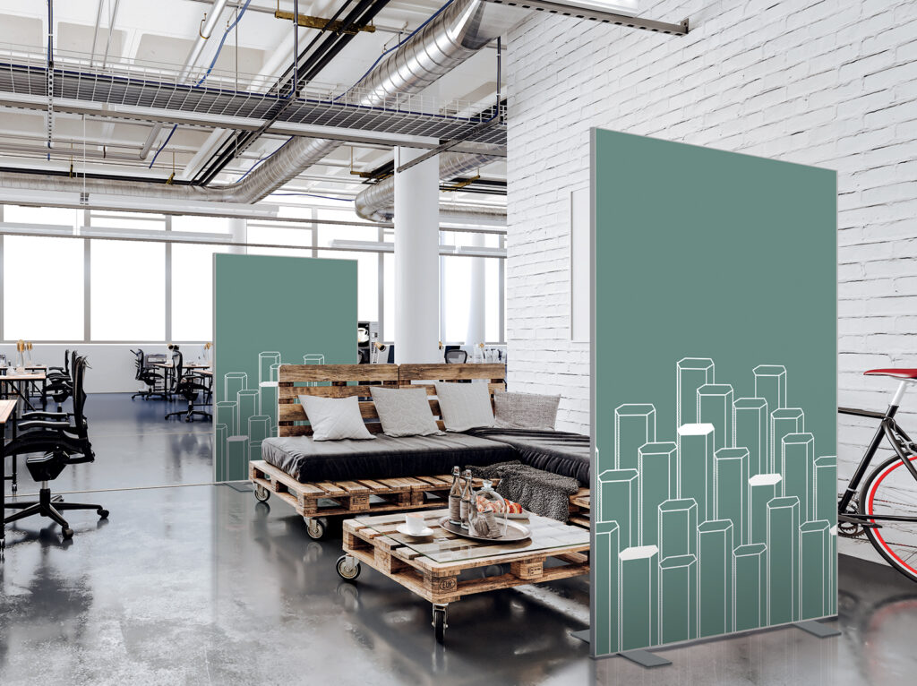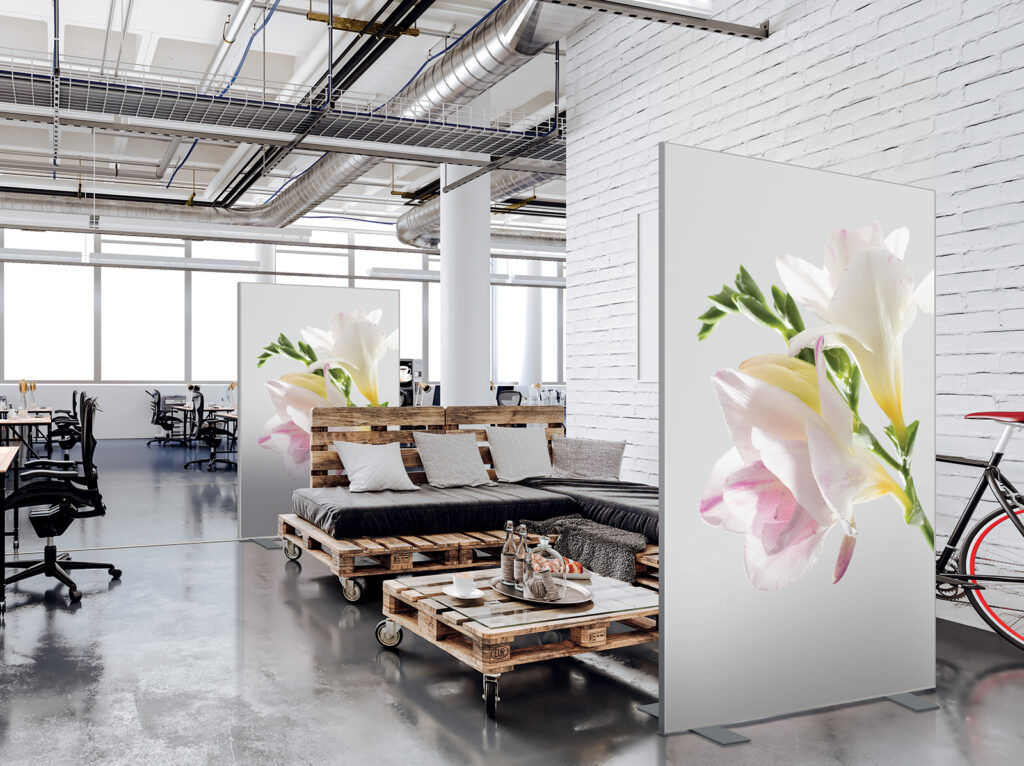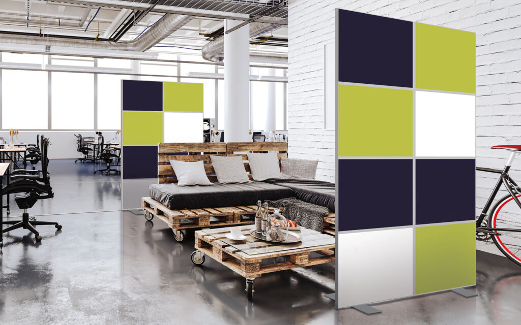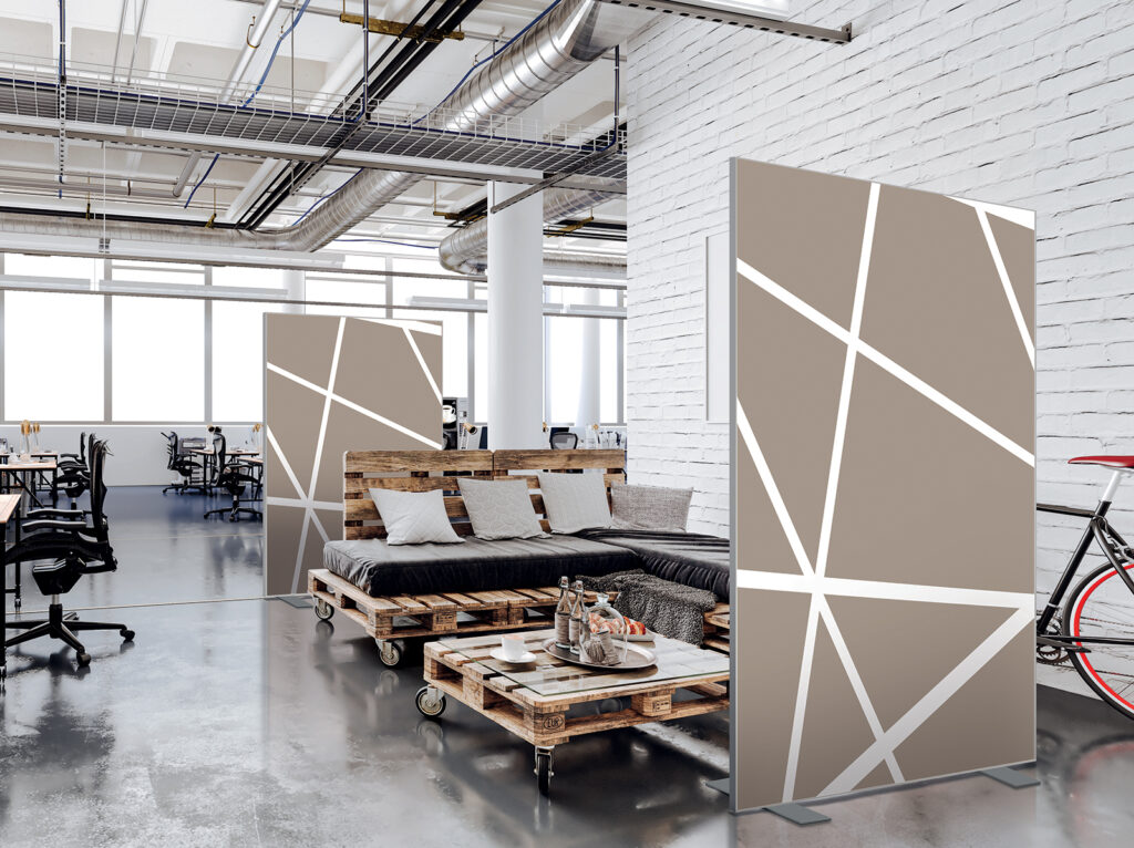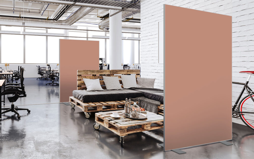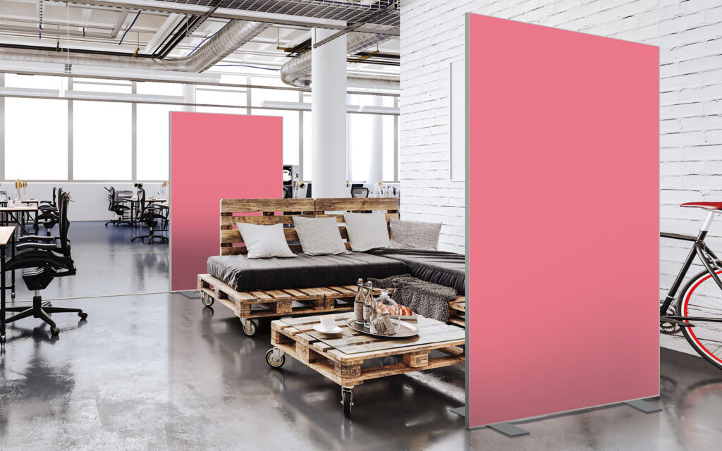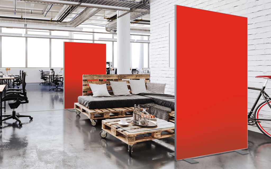 Les cloisons amovibles sont idéales pour séparer et moduler les espaces et, parce qu'elles profitent de toute la gamme de toiles Imago, elles apportent une touche décorative forte. En version sur pied, elles se déplacent partout pour répondre aux besoins. Sur vérins, installées du sol au plafond, elles marquent clairement les espaces. De plus, grâce à leur mousse acoustique intégrée, elles contribuent à réduire les nuisances sonores.