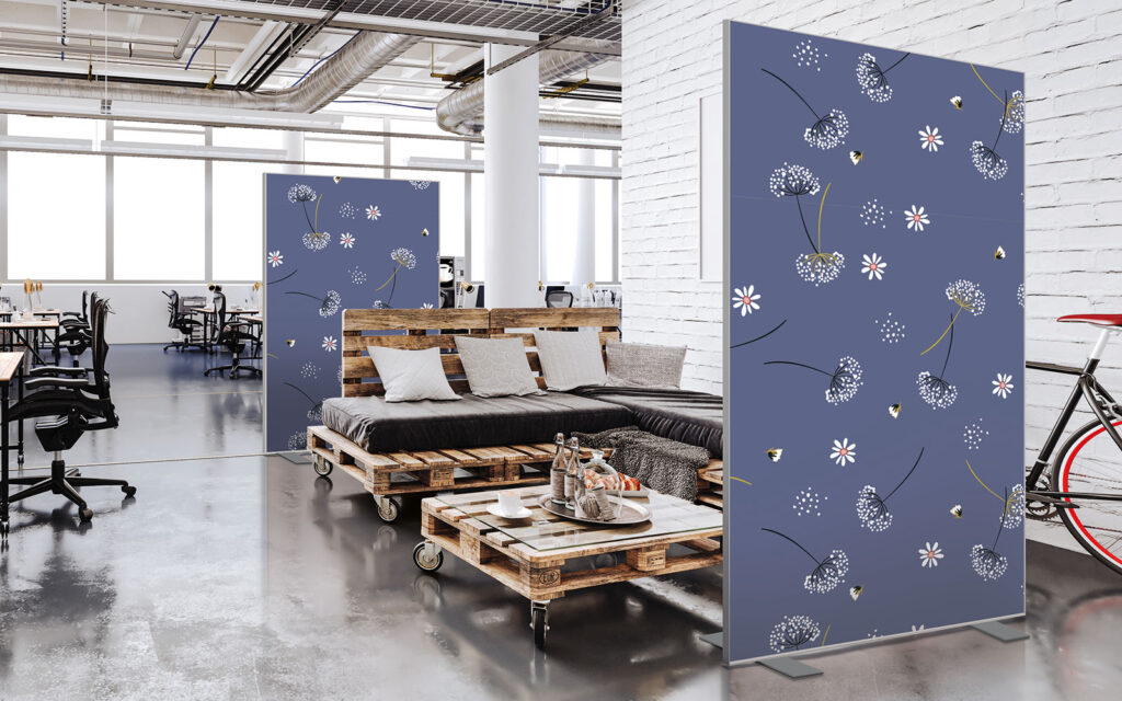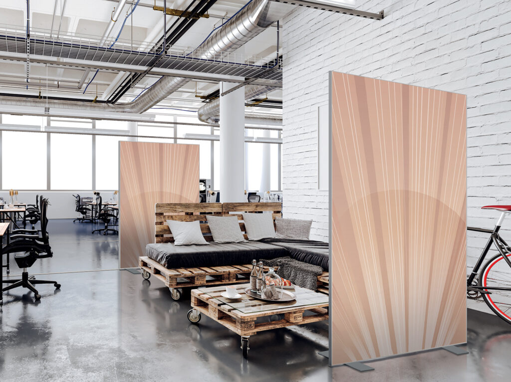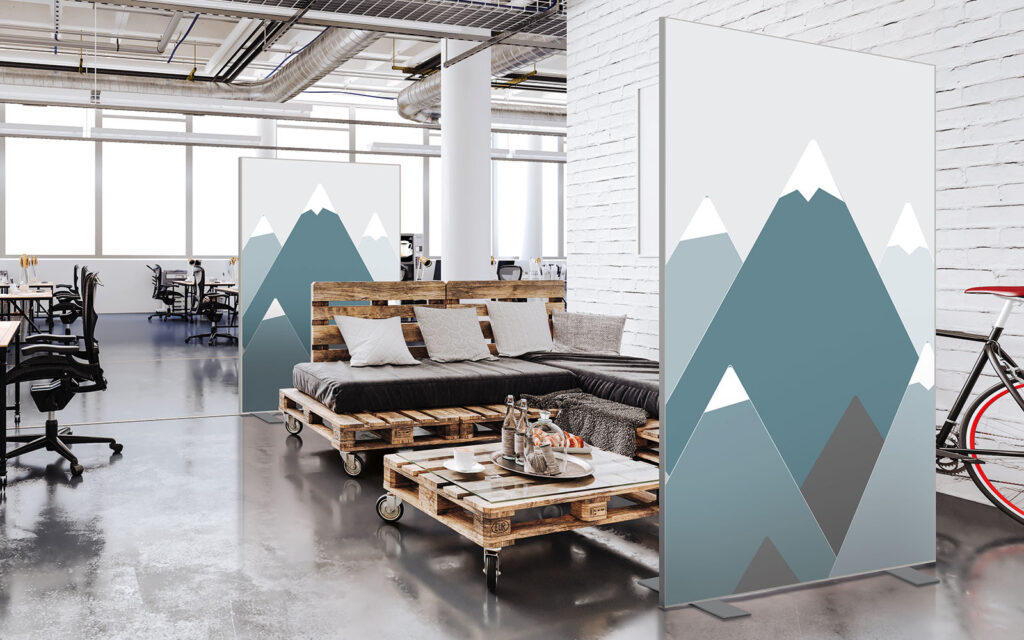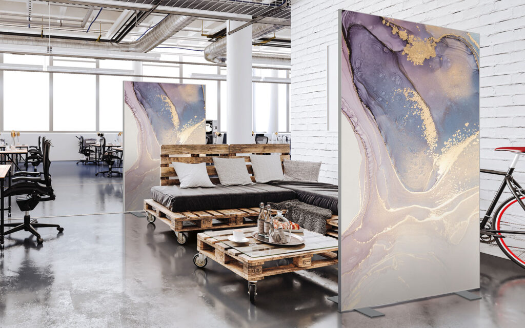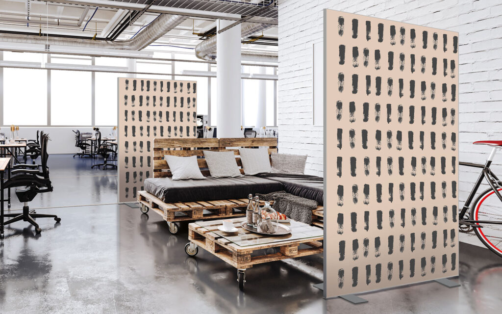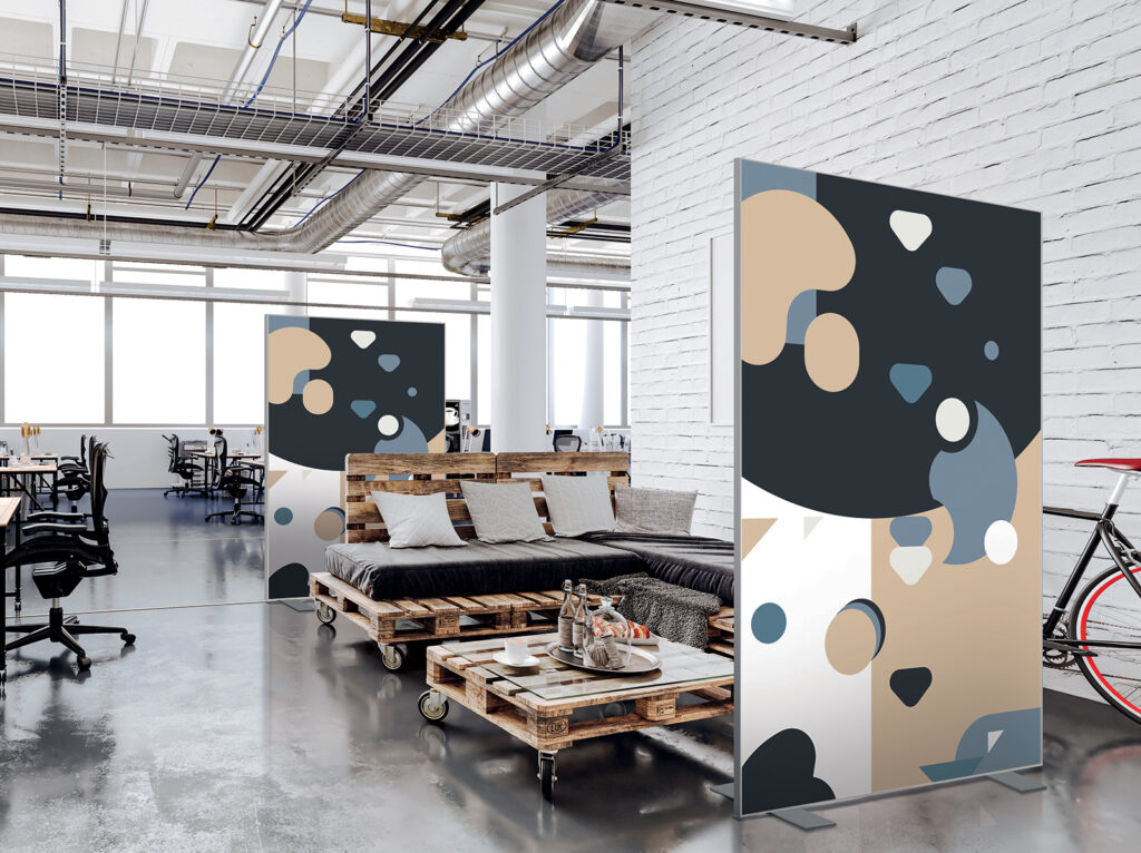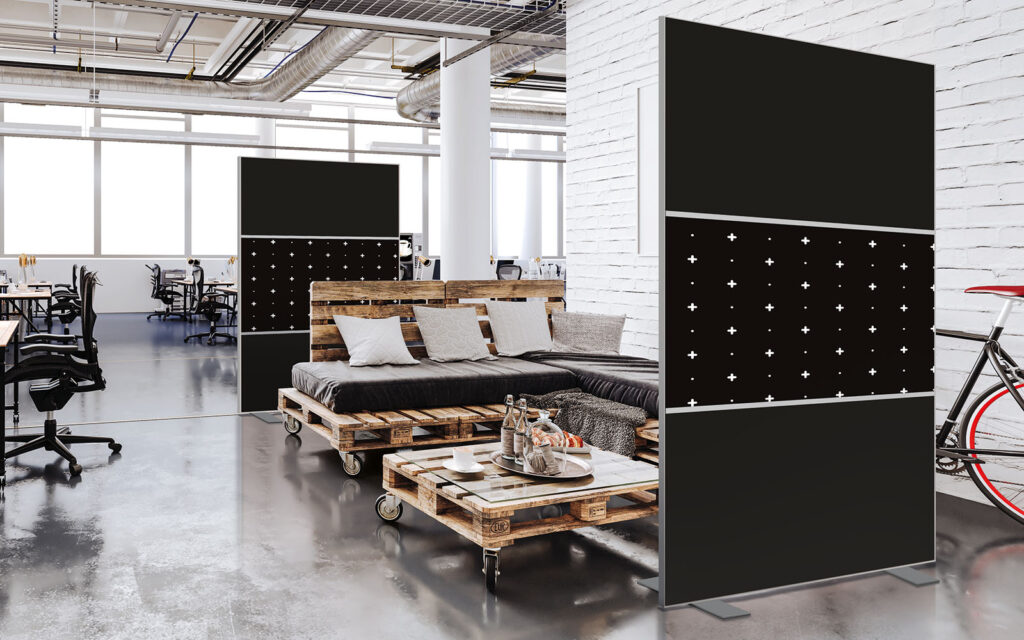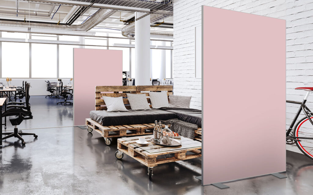 Les cloisons amovibles sont idéales pour séparer et moduler les espaces et, parce qu'elles profitent de toute la gamme de toiles Imago, elles apportent une touche décorative forte. En version sur pied, elles se déplacent partout pour répondre aux besoins. Sur vérins, installées du sol au plafond, elles marquent clairement les espaces. De plus, grâce à leur mousse acoustique intégrée, elles contribuent à réduire les nuisances sonores.