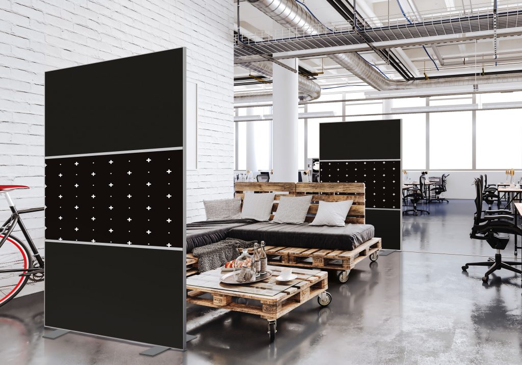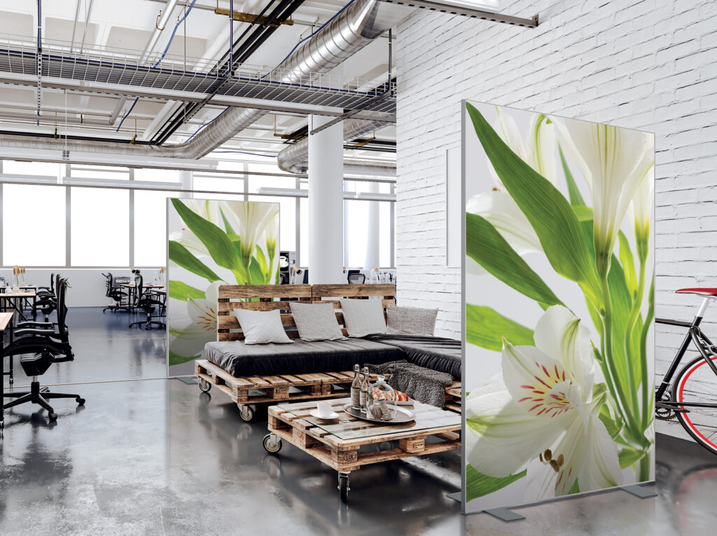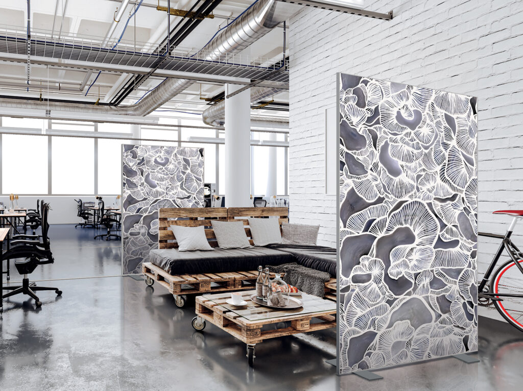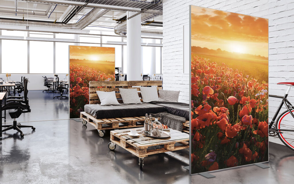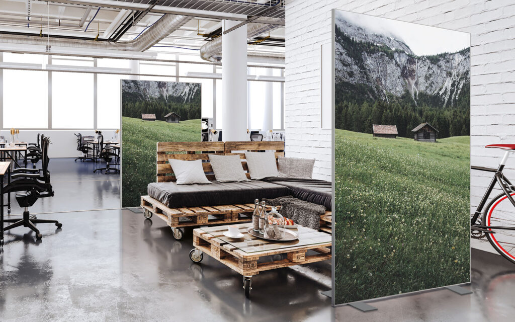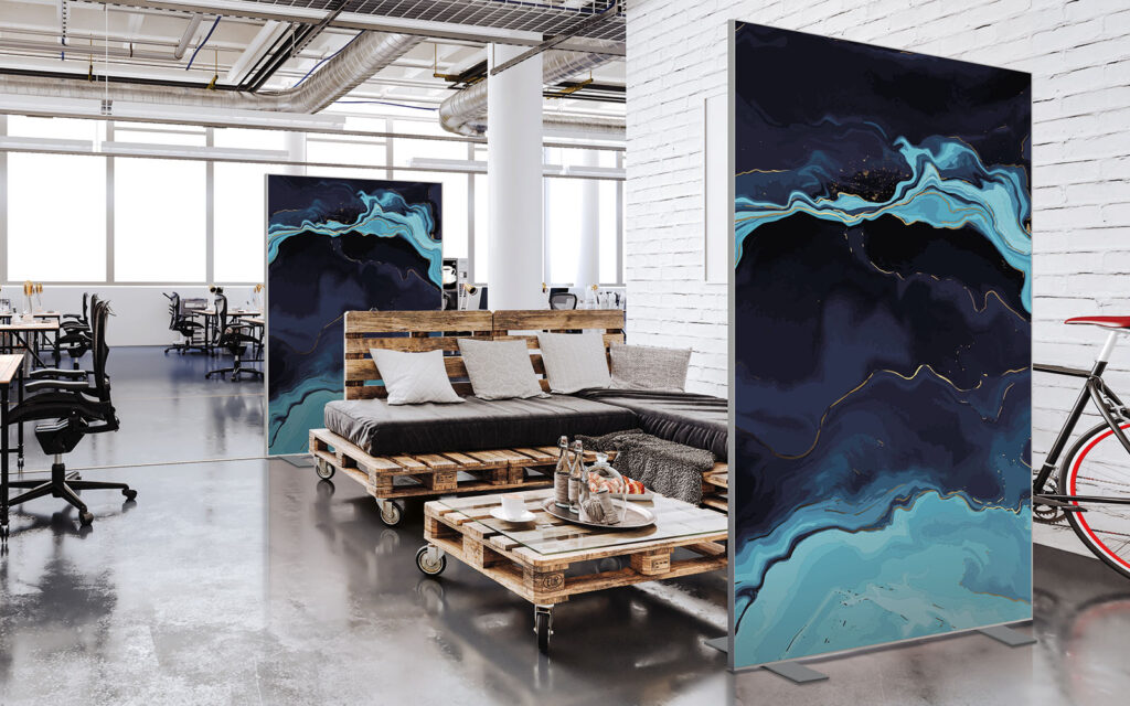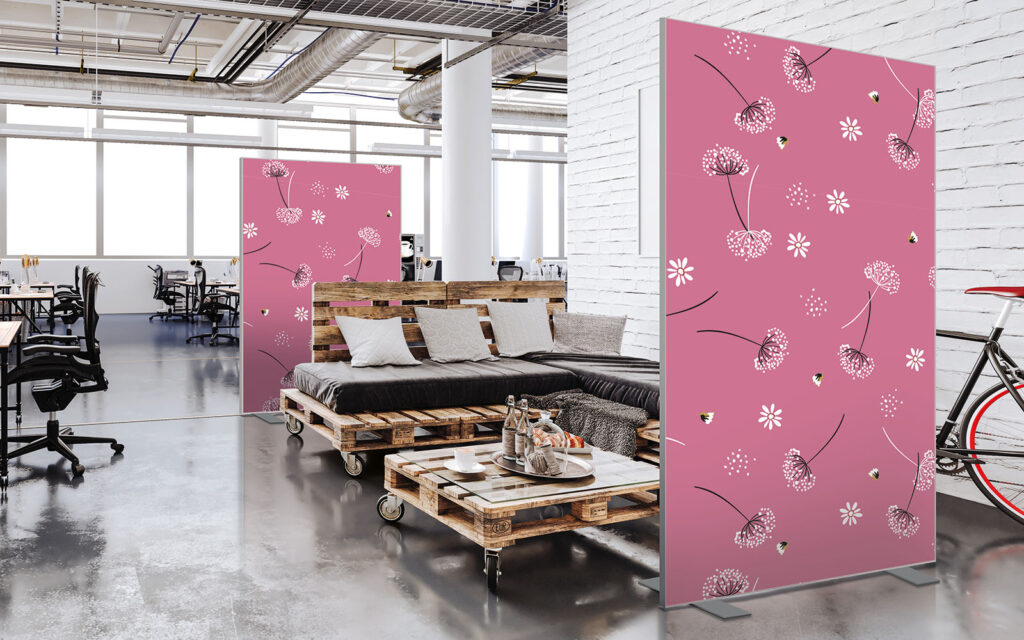 Les cloisons amovibles sont idéales pour séparer et moduler les espaces et, parce qu'elles profitent de toute la gamme de toiles Imago, elles apportent une touche décorative forte. En version sur pied, elles se déplacent partout pour répondre aux besoins. Sur vérins, installées du sol au plafond, elles marquent clairement les espaces. De plus, grâce à leur mousse acoustique intégrée, elles contribuent à réduire les nuisances sonores.