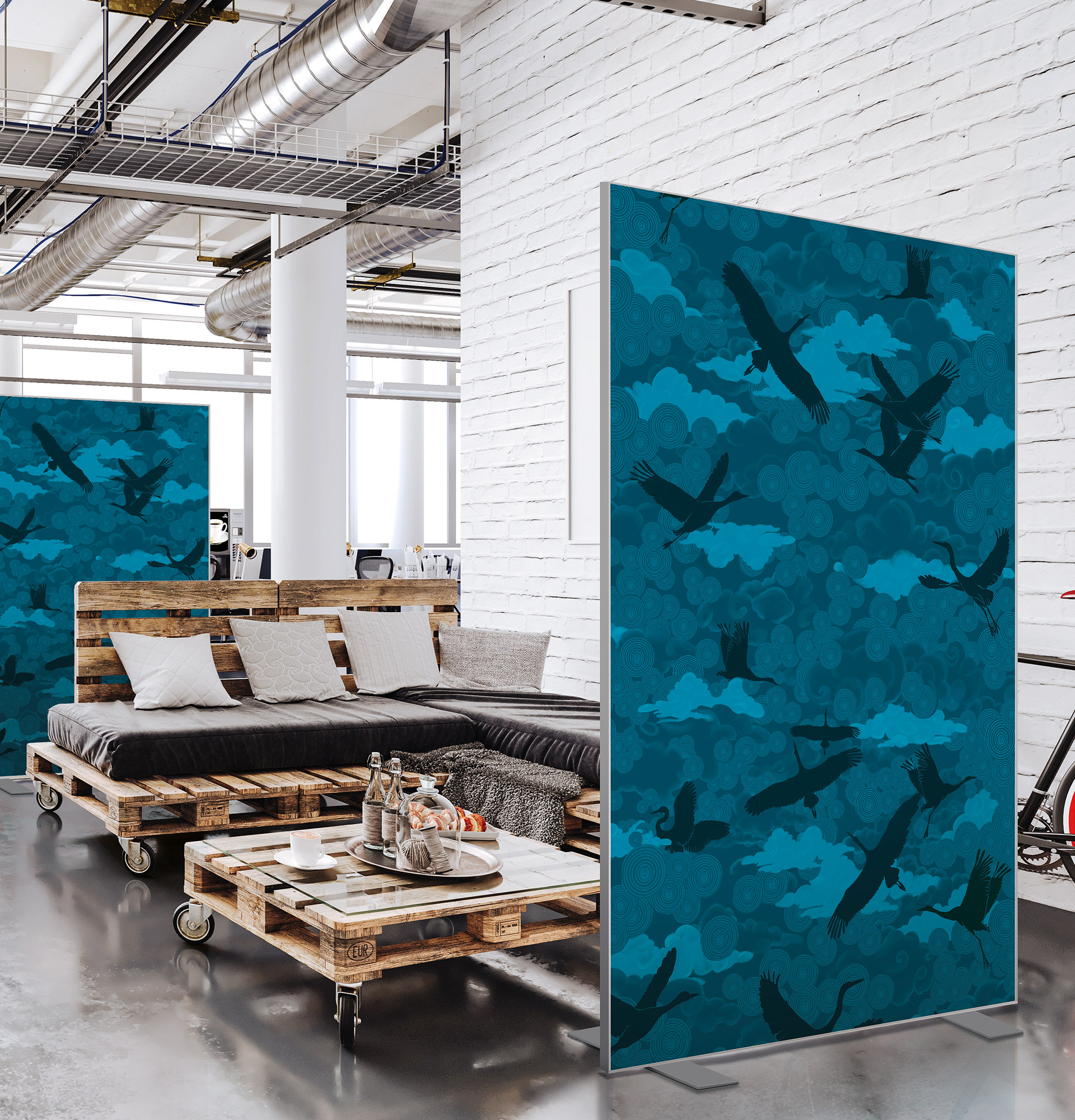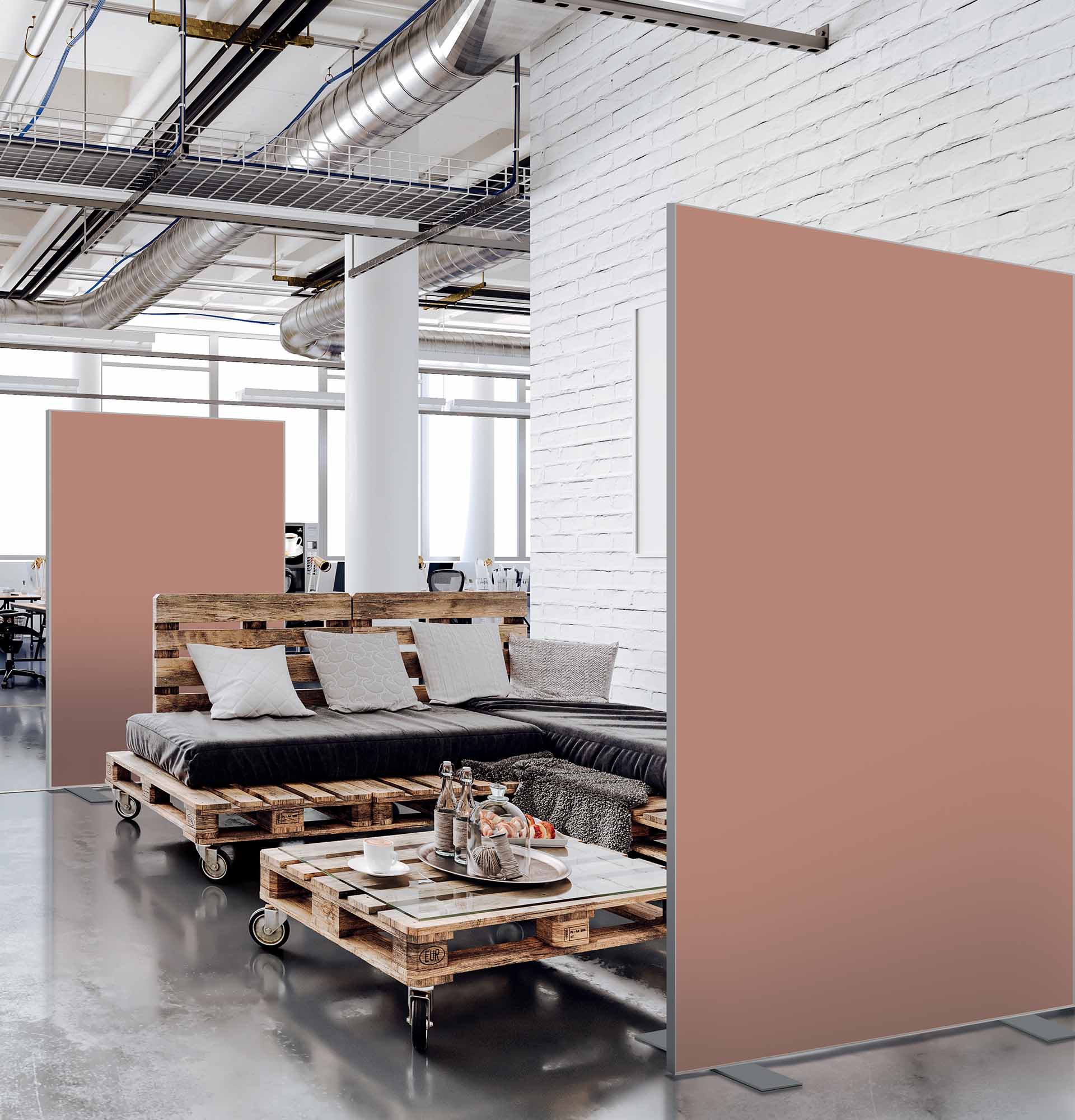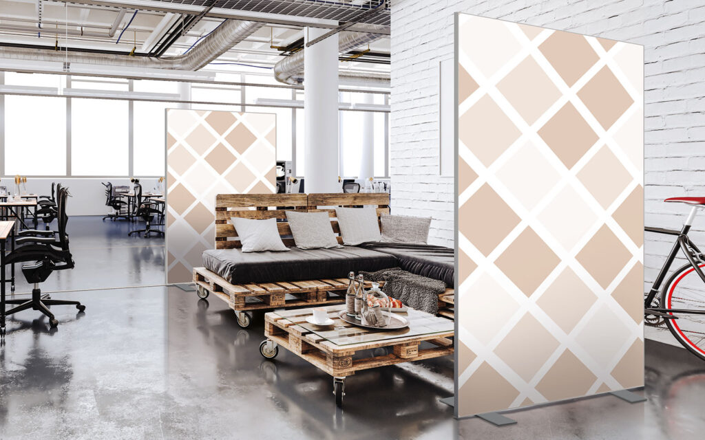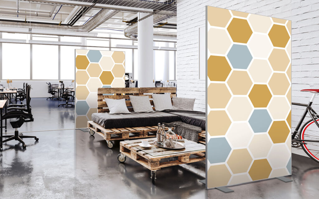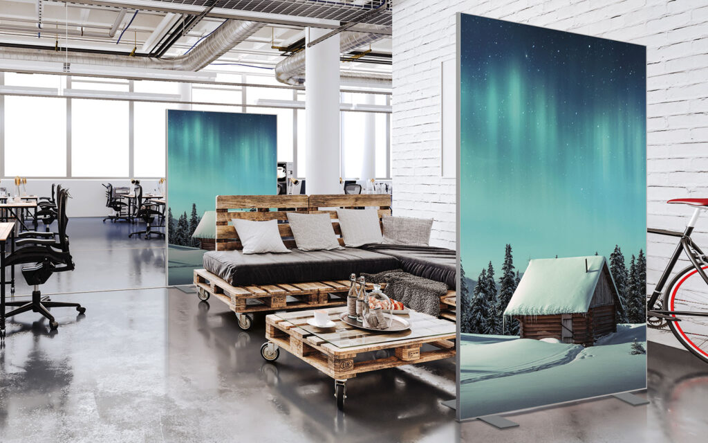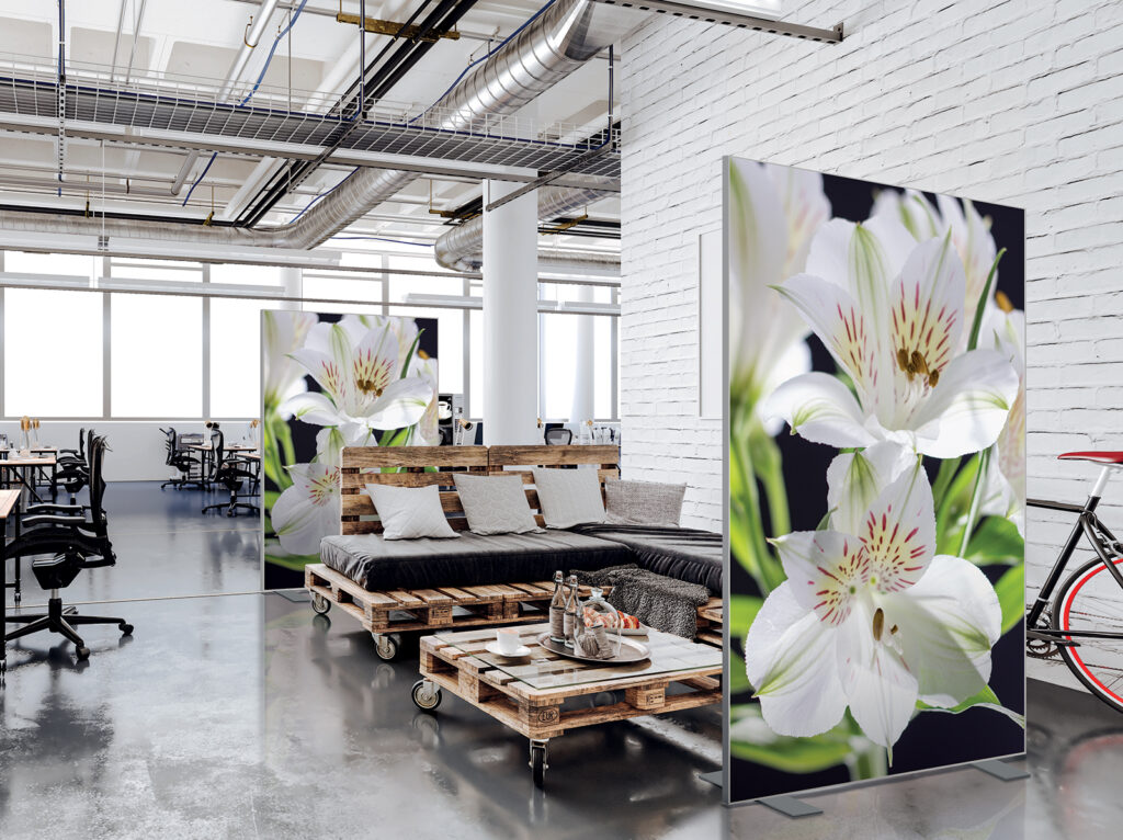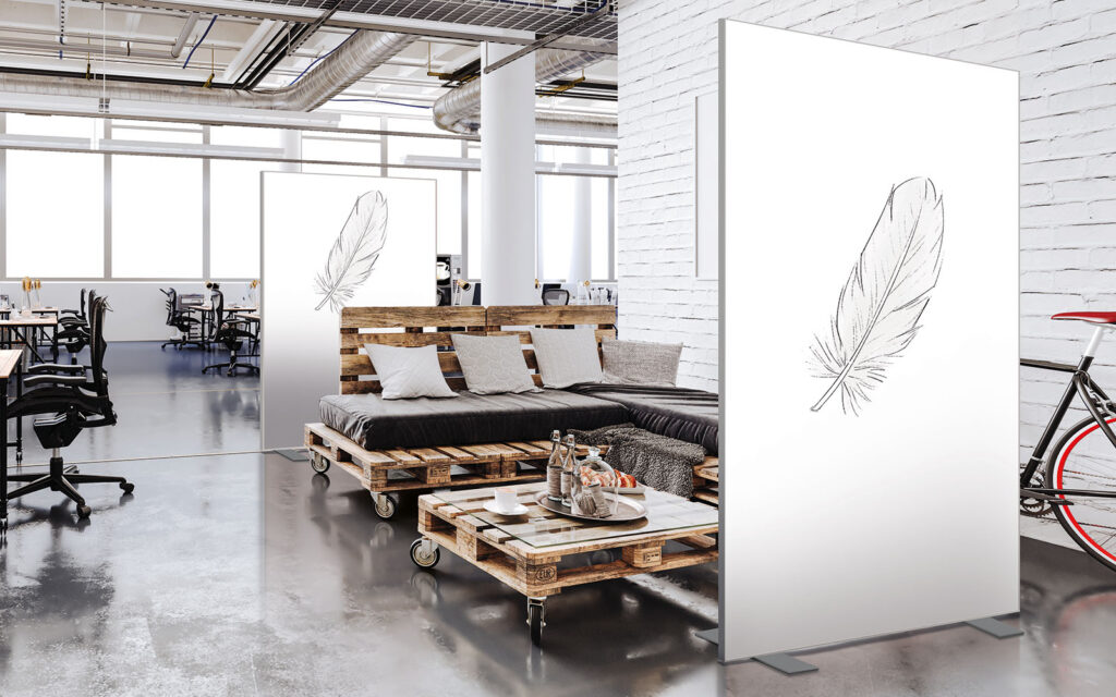 Les cloisons amovibles sont idéales pour séparer et moduler les espaces et, parce qu'elles profitent de toute la gamme de toiles Imago, elles apportent une touche décorative forte. En version sur pied, elles se déplacent partout pour répondre aux besoins. Sur vérins, installées du sol au plafond, elles marquent clairement les espaces. De plus, grâce à leur mousse acoustique intégrée, elles contribuent à réduire les nuisances sonores.