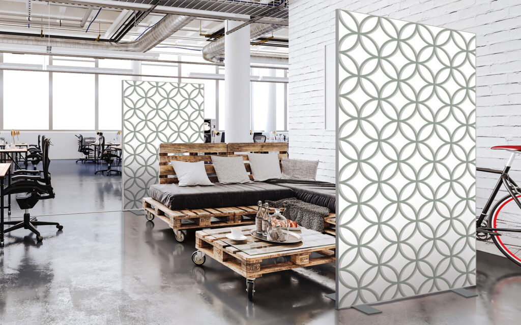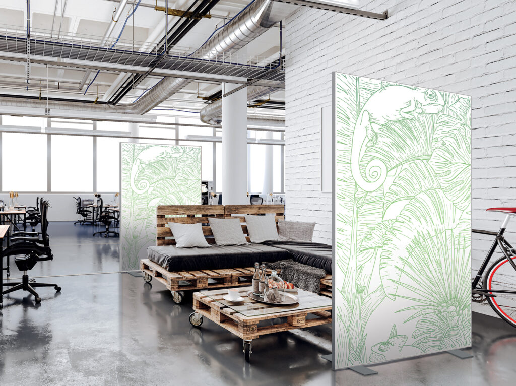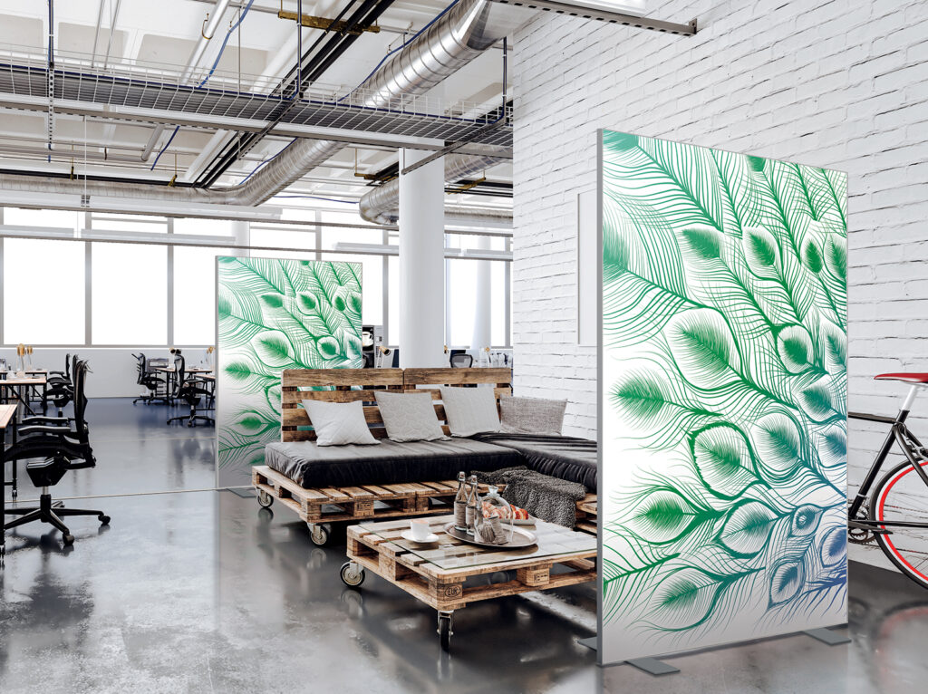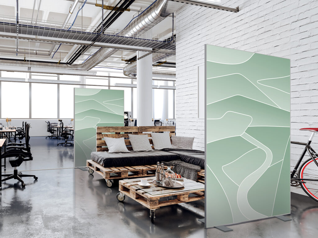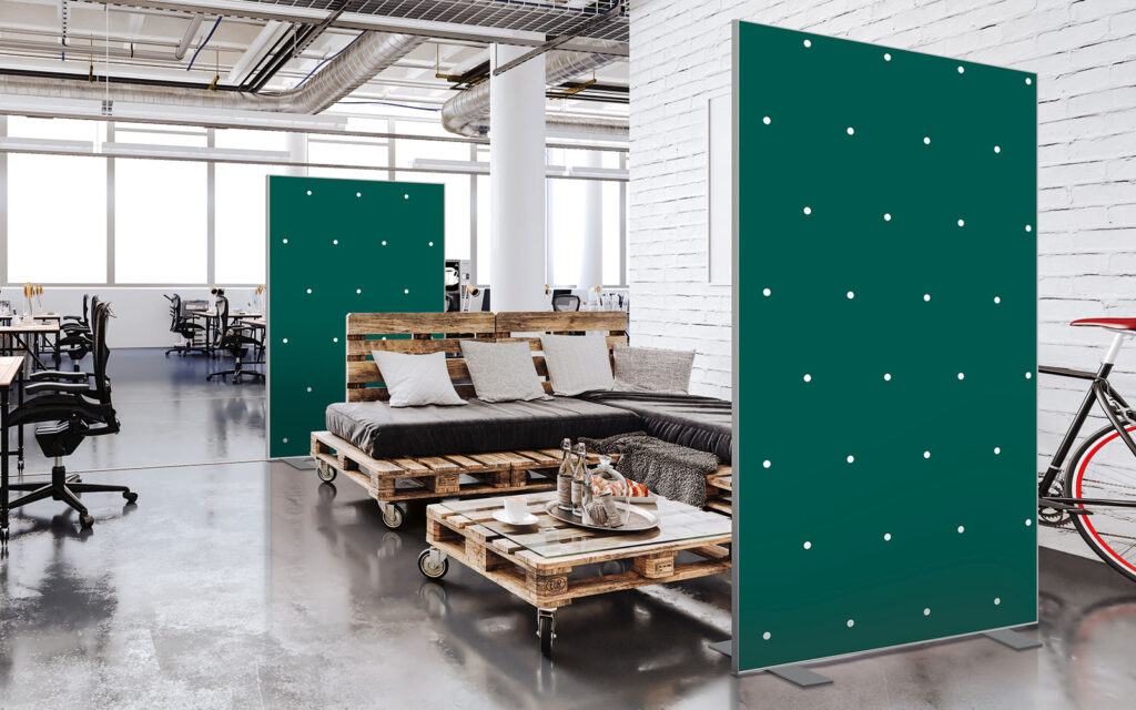 Cloison amovible sur pieds, hauteur 1,90 m, largeur 1,50 m, modèles 20’s et Points en vert tropical