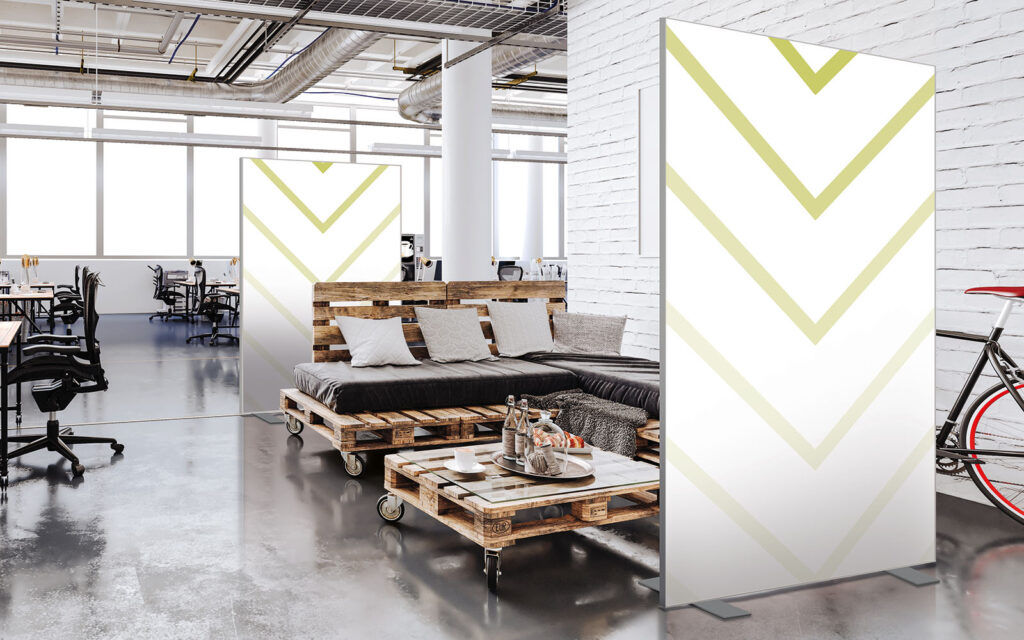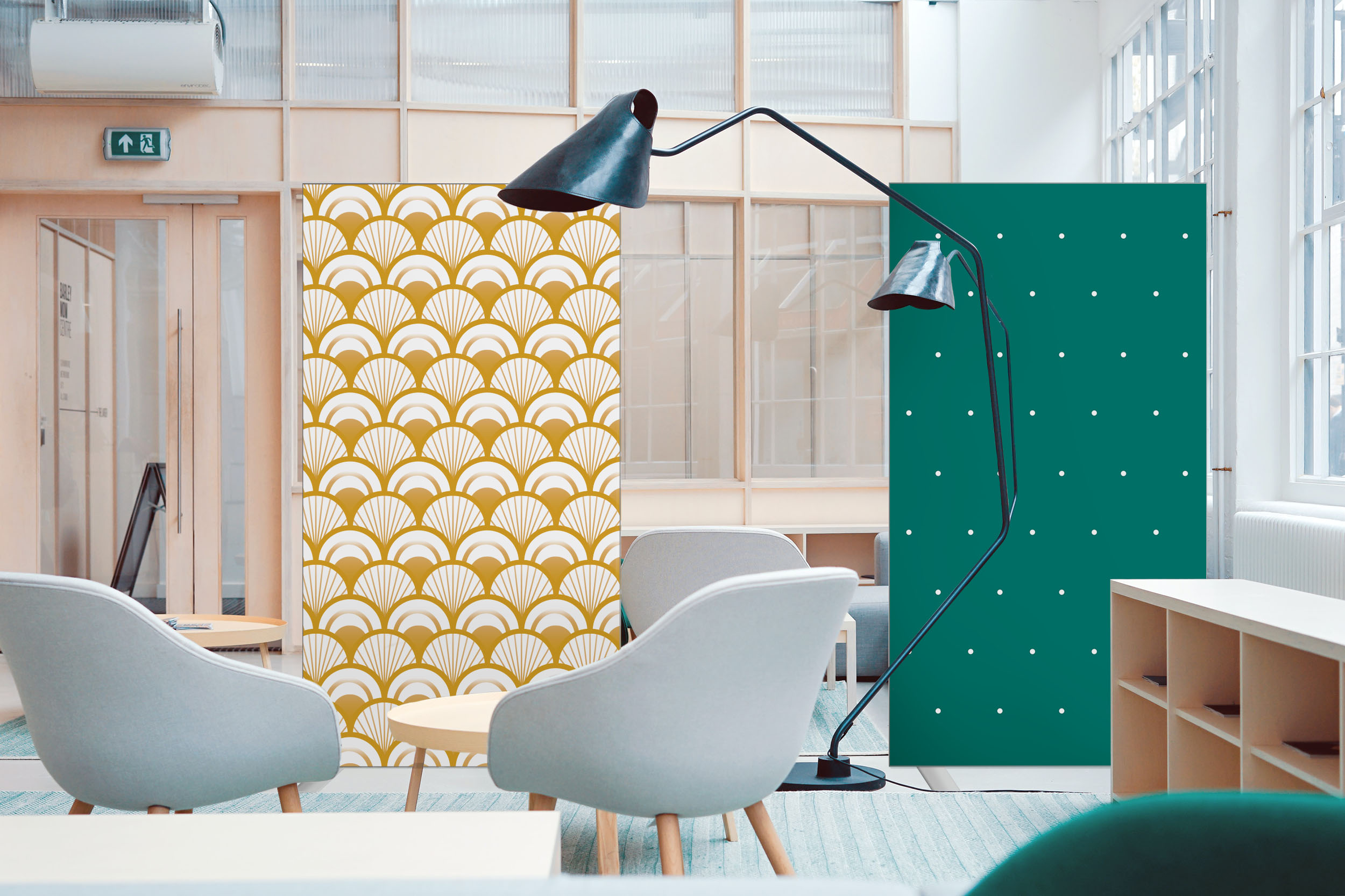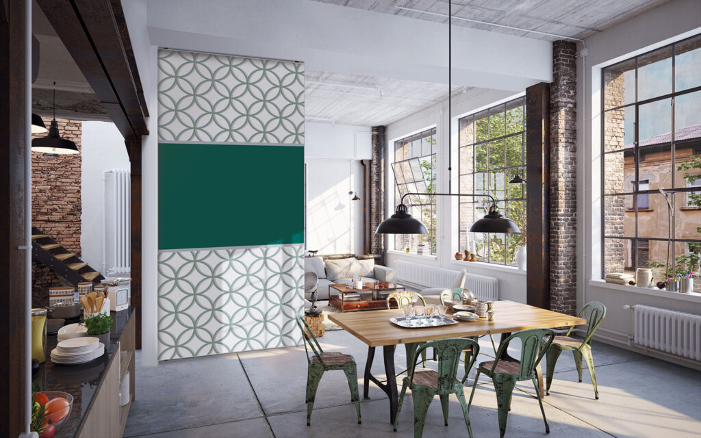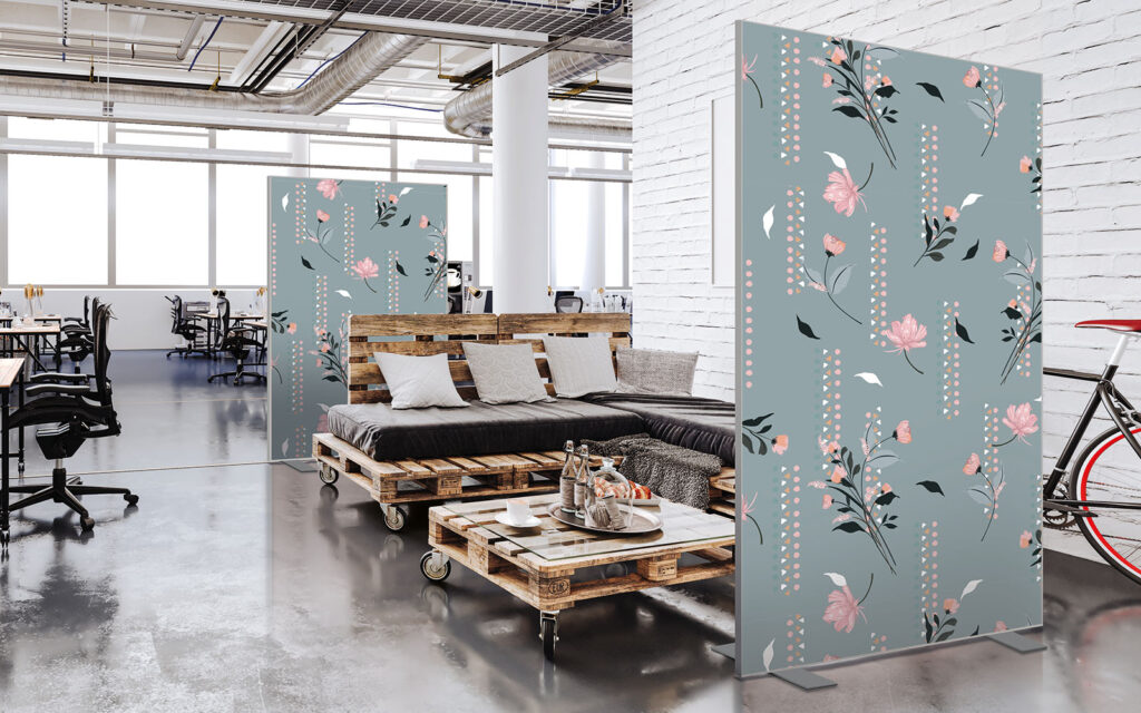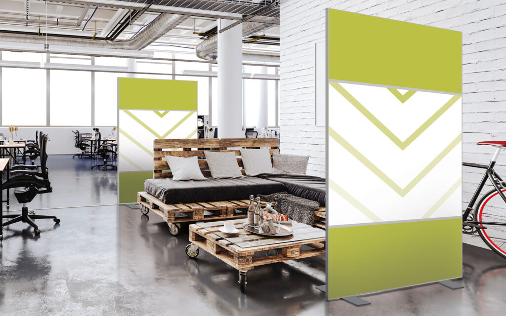 Cloison amovible sur pieds, hauteur 1,90 m, largeur 1,50 m, modèles 20’s et Points en vert tropical