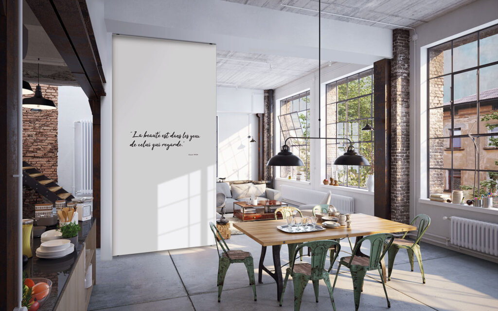 Il s’agit d’une cloison qui va être facilement déplaçable, voire transportable. D’une hauteur variant de 75 centimètres à 2 mètres, son cadre repose sur deux platines argentées. Cette déclinaison se fait paravent. Ainsi, vous agencez les pièces à votre convenance et isolez certains coins pour plus d’intimité.