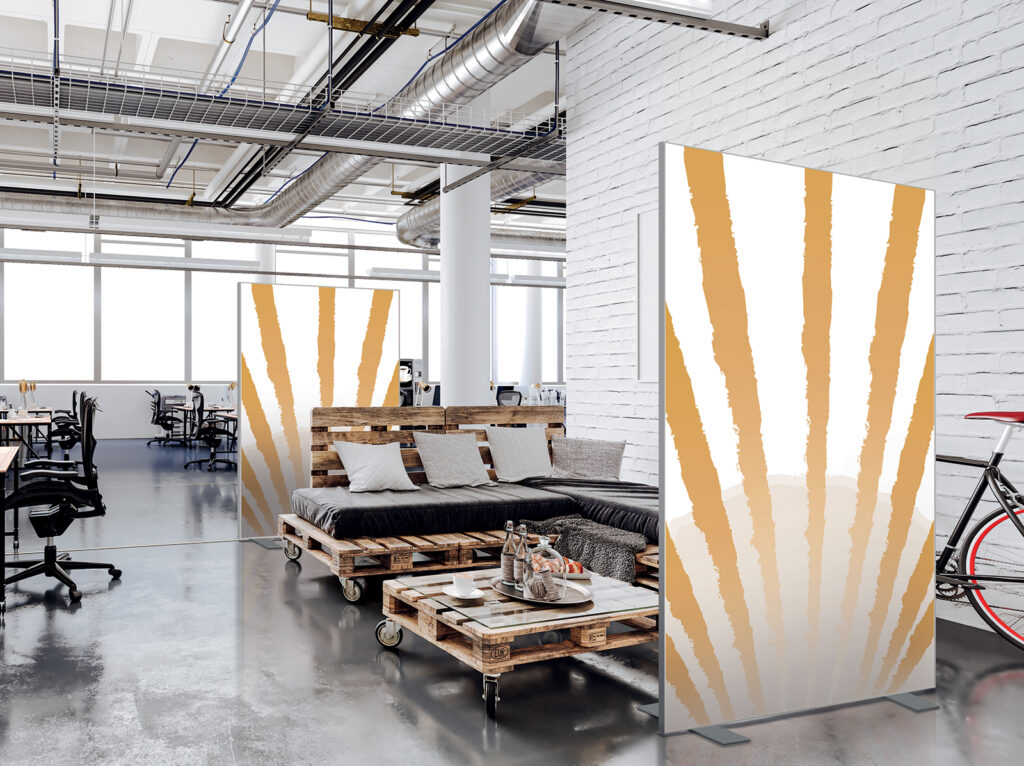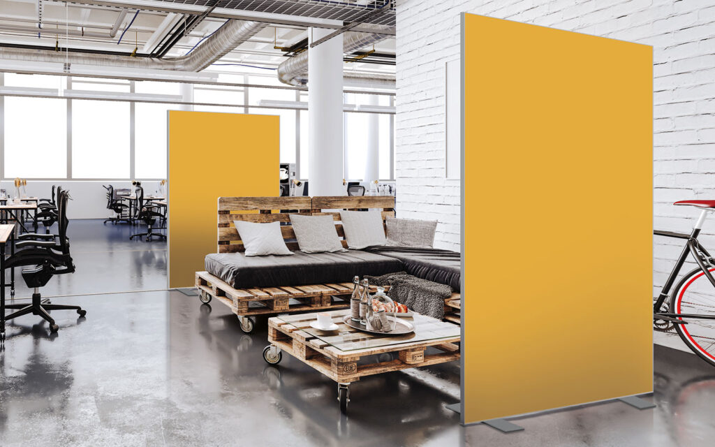 Cloisons amovibles sur pieds, hauteur 1,90 m, largeur 1,50 m, modèle Reflets en jaune épice et terracotta