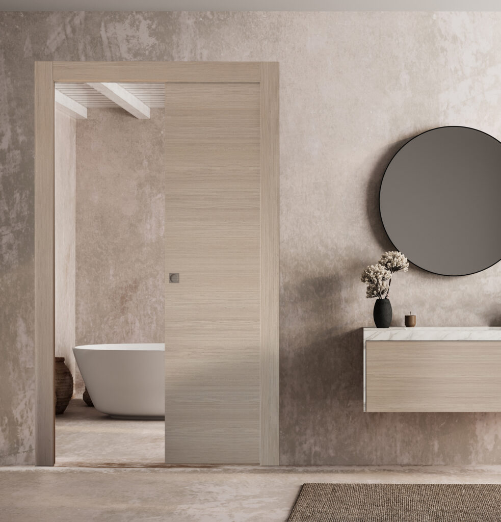 La salle de bain peut être séparée du reste de la suite parentale par une porte coulissante à galandage afin de ne pas empiéter sur l’espace environnant.