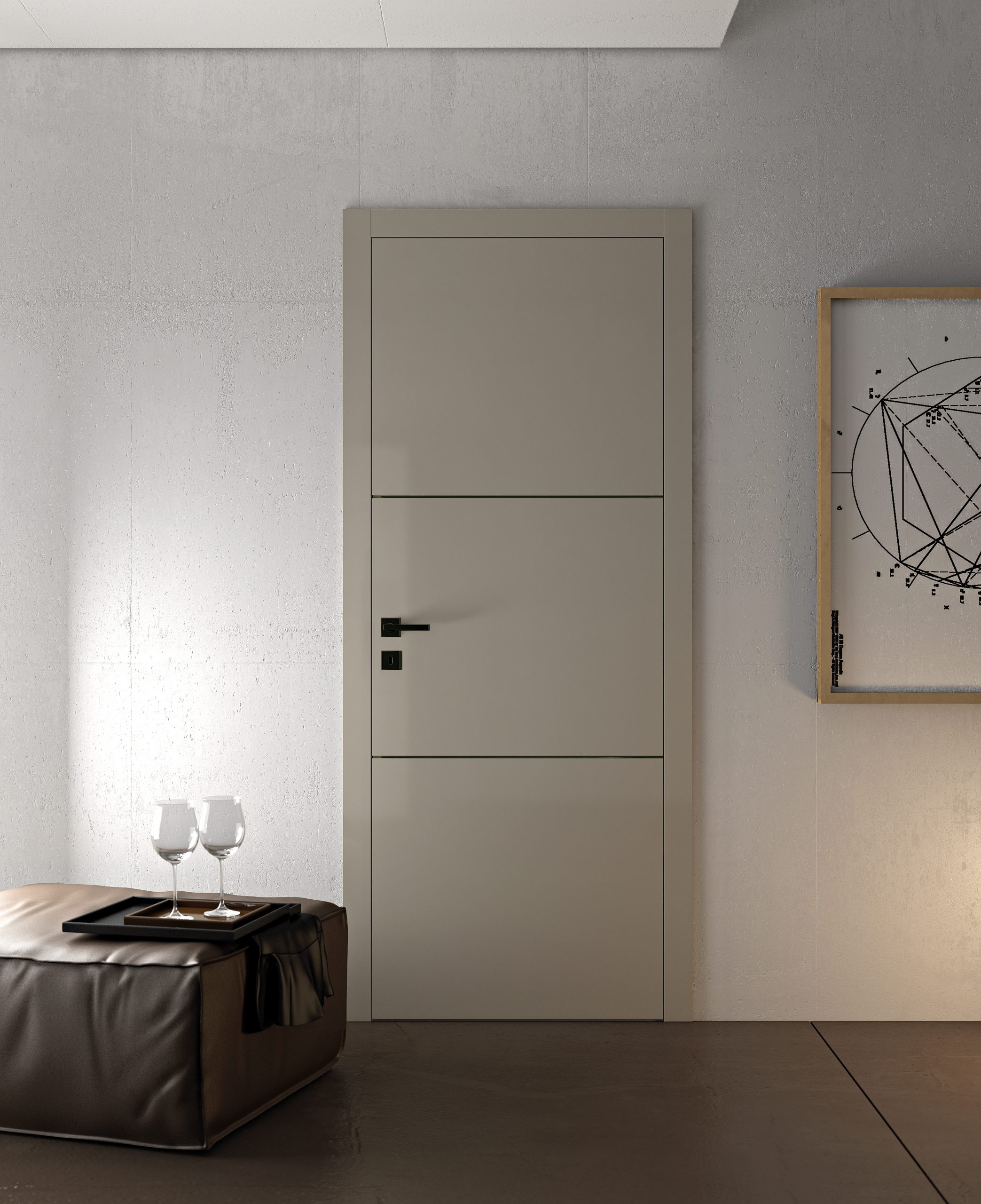 Bloc-porte DÉCO, modèle Riga Modena, laque Argilla, largeur 83 cm, poignée Genoa noire