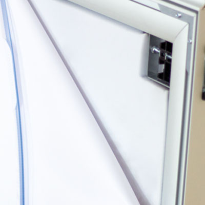En effet, elle se structure sur un cadre en aluminium avec une rainure. La toile est équipée d’un jonc sur ses quatre côtés, ce qui permet de la tendre et recouvrir le cadre presque intégralement. Les angles du cadre sont renforcés par des équerres pour assurer sa stabilité.