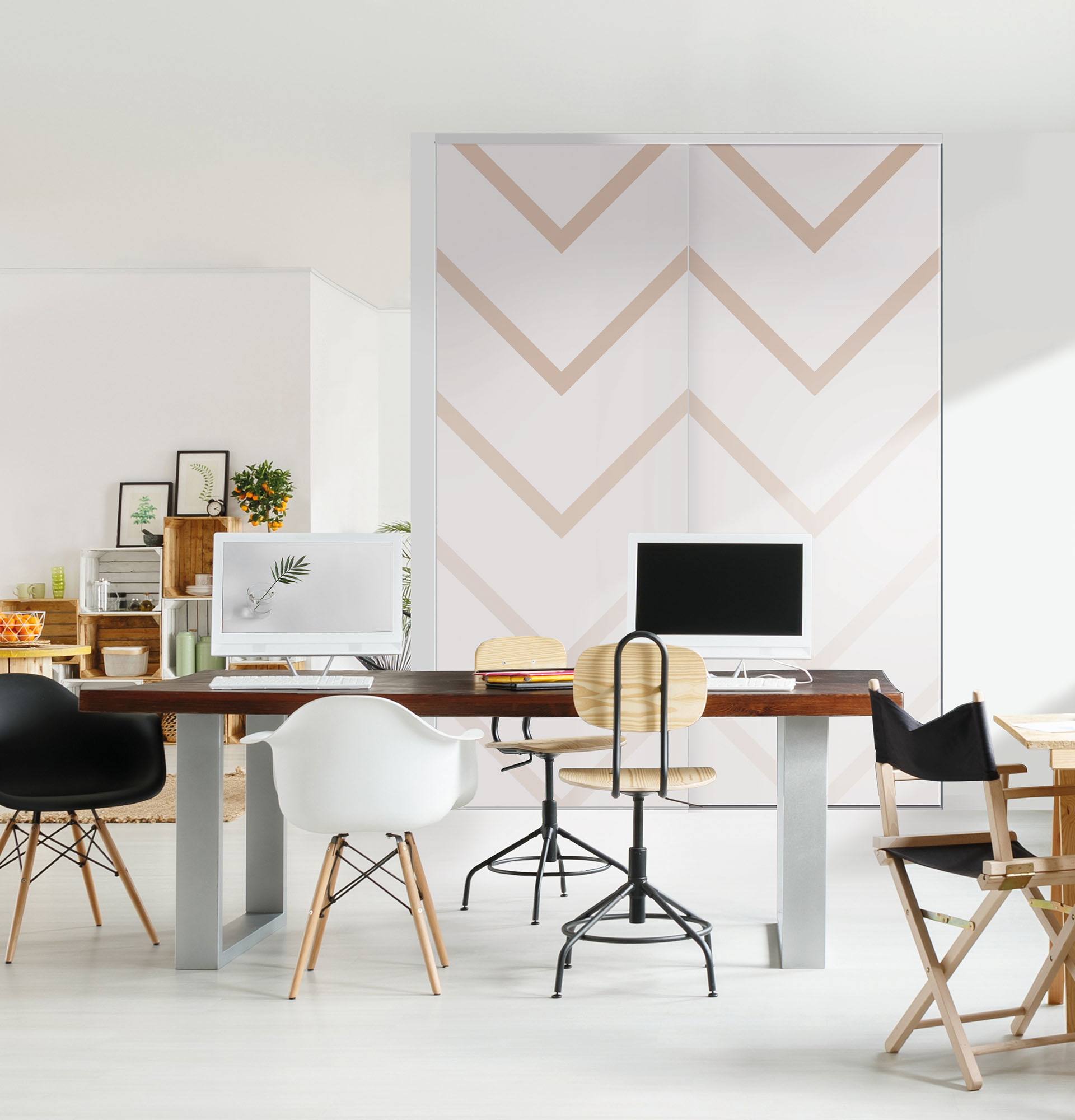 Les modèles Sillage permettent d’associer différentes couleurs et / ou motifs pour créer une porte unique. En alliant des éléments graphiques avec des rappels de formes ou de teintes, il est possible d’obtenir un séparateur de bureau en adéquation parfaite avec votre décoration globale.