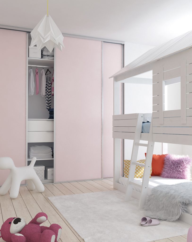 Portes de placard coulissantes profil Agate argent, modèle intégra décor rose poudré – hauteur 2,50 m, largeur totale 2,70 m