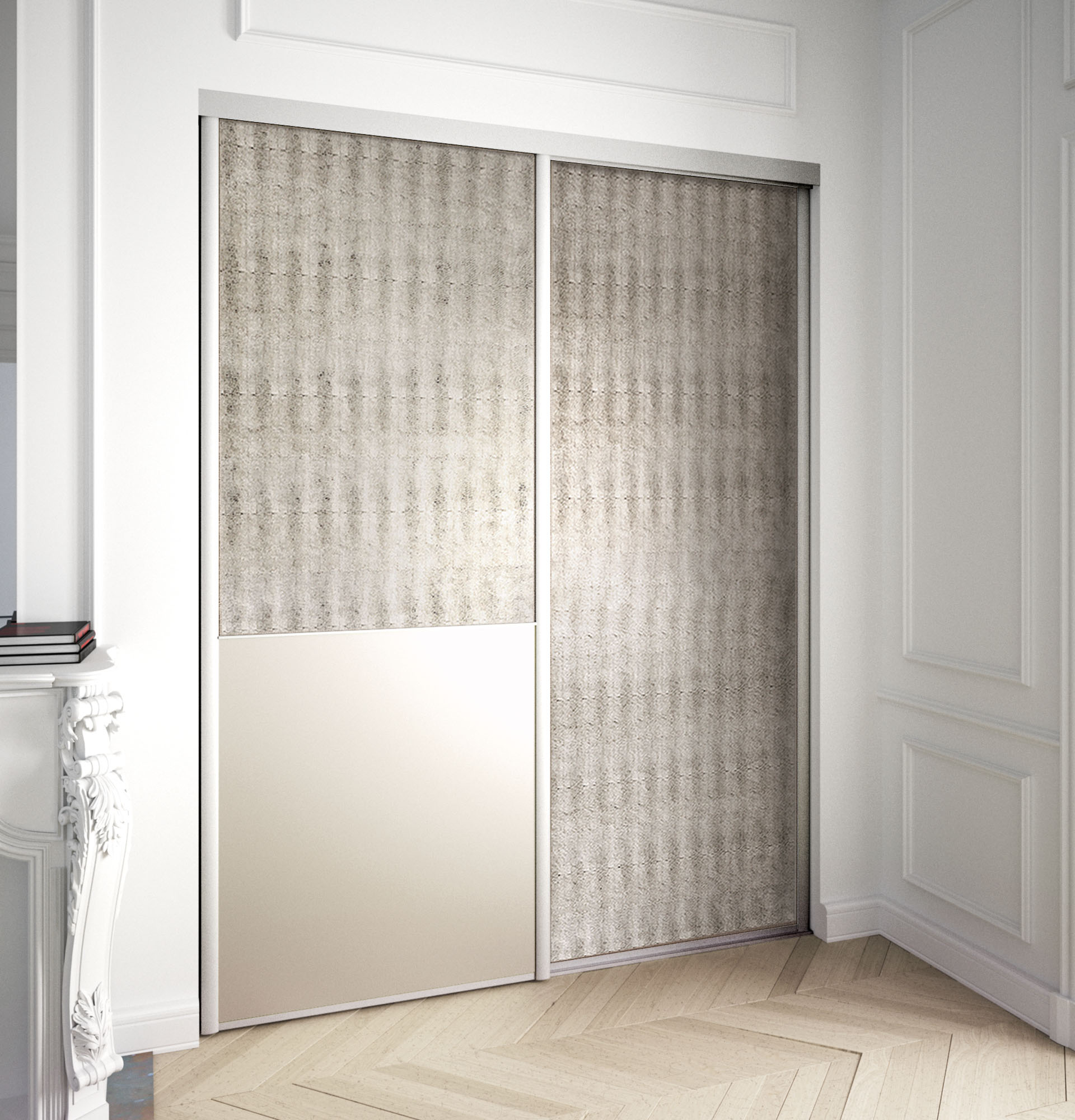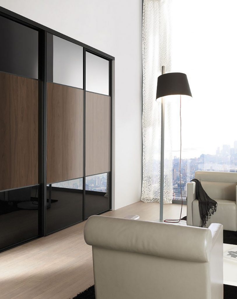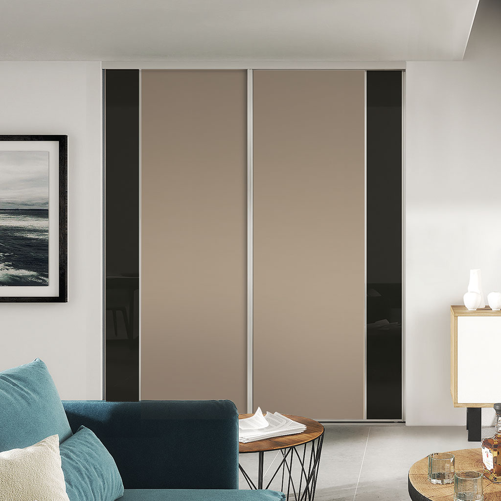 Le profil Strass en version coulissante peut se décliner dans les modèles Sillage, des portes de placards à partitions personnalisables. Laissez libre cours à votre imagination en mélangeant les matières.