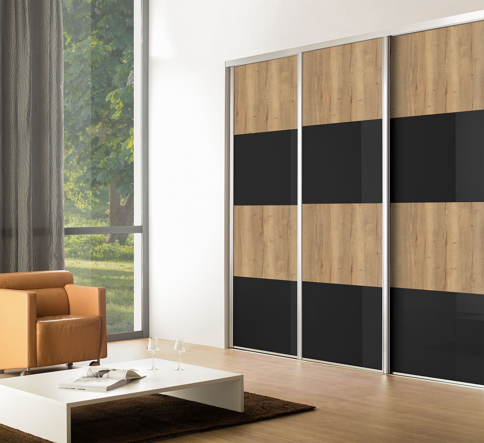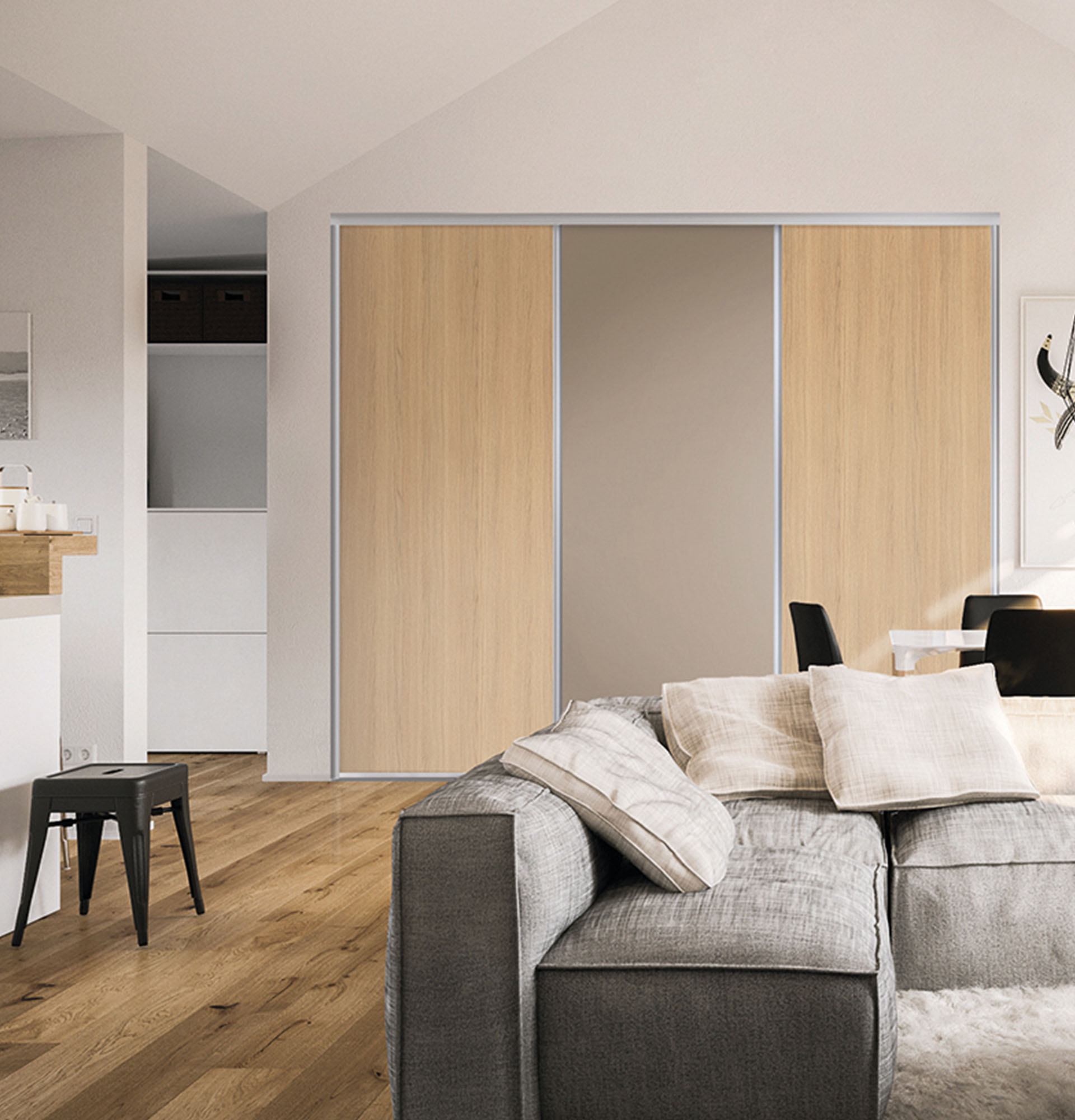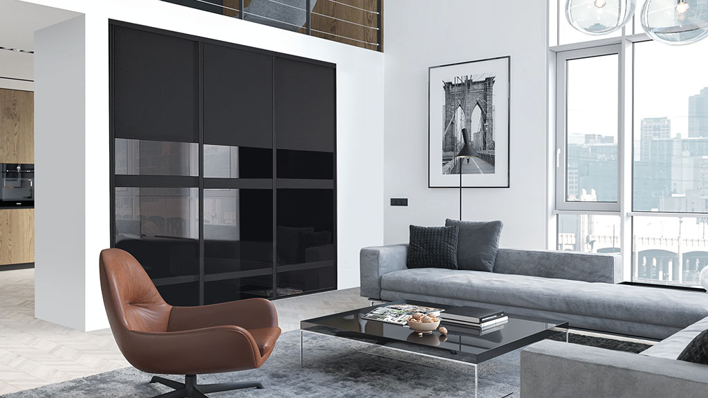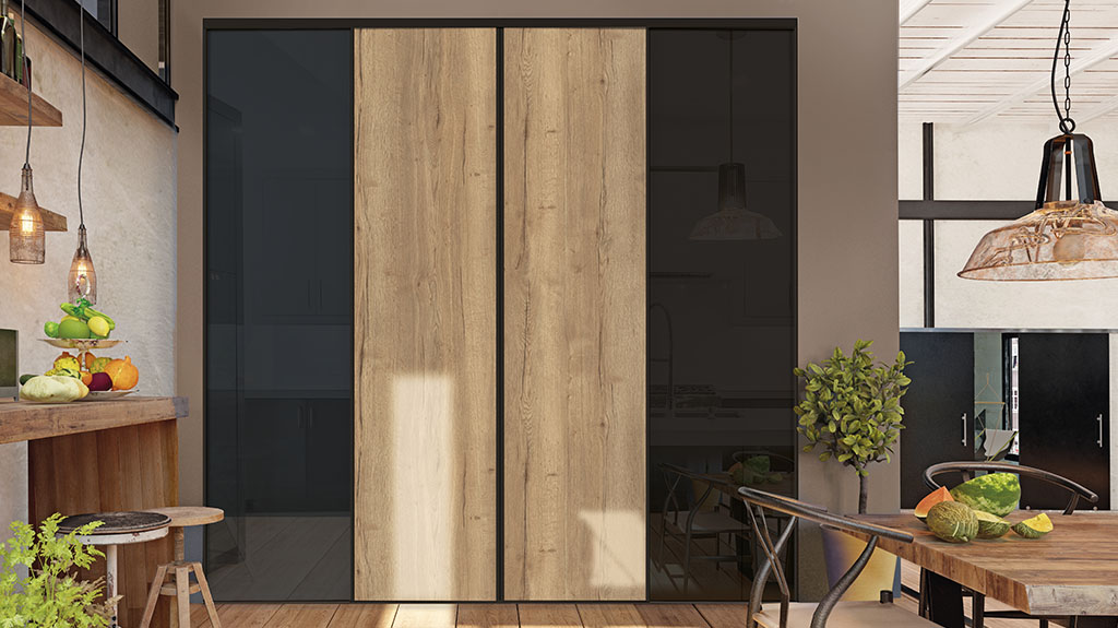 Le profil Strass en version coulissante peut se décliner dans les modèles Sillage, des portes de placards à partitions personnalisables. Laissez libre cours à votre imagination en mélangeant les matières.