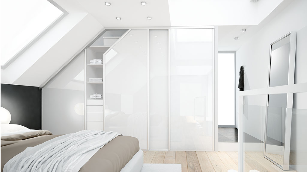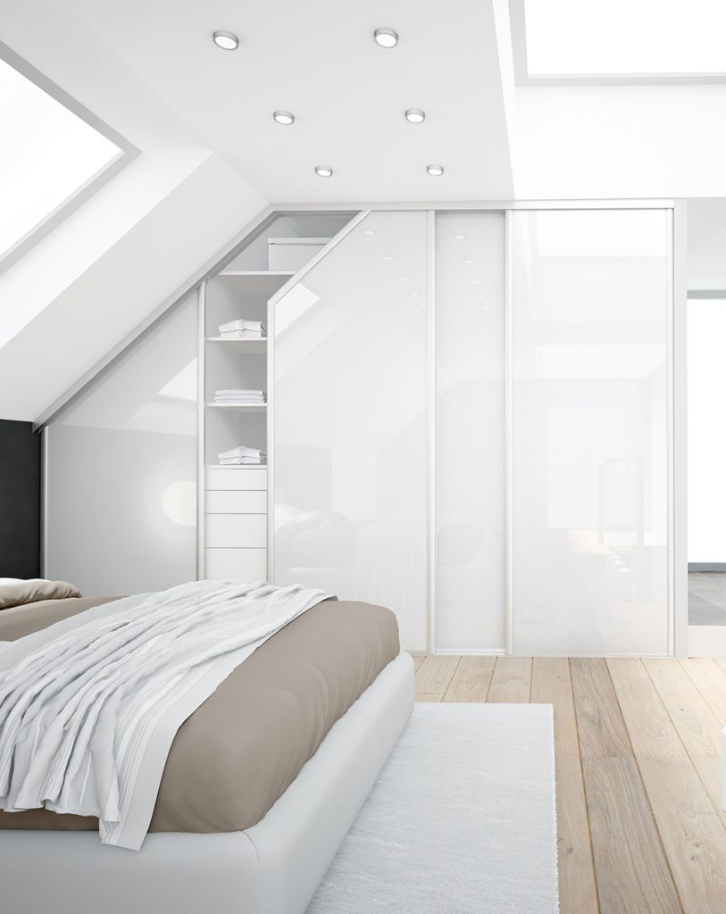 Portes de placard coulissantes, profil Platine argent mat et vitre laquée blanc artic, avec pan coupé pour s’adapter à l’angle du toit – hauteur 2,50 m, largeur totale 4 m