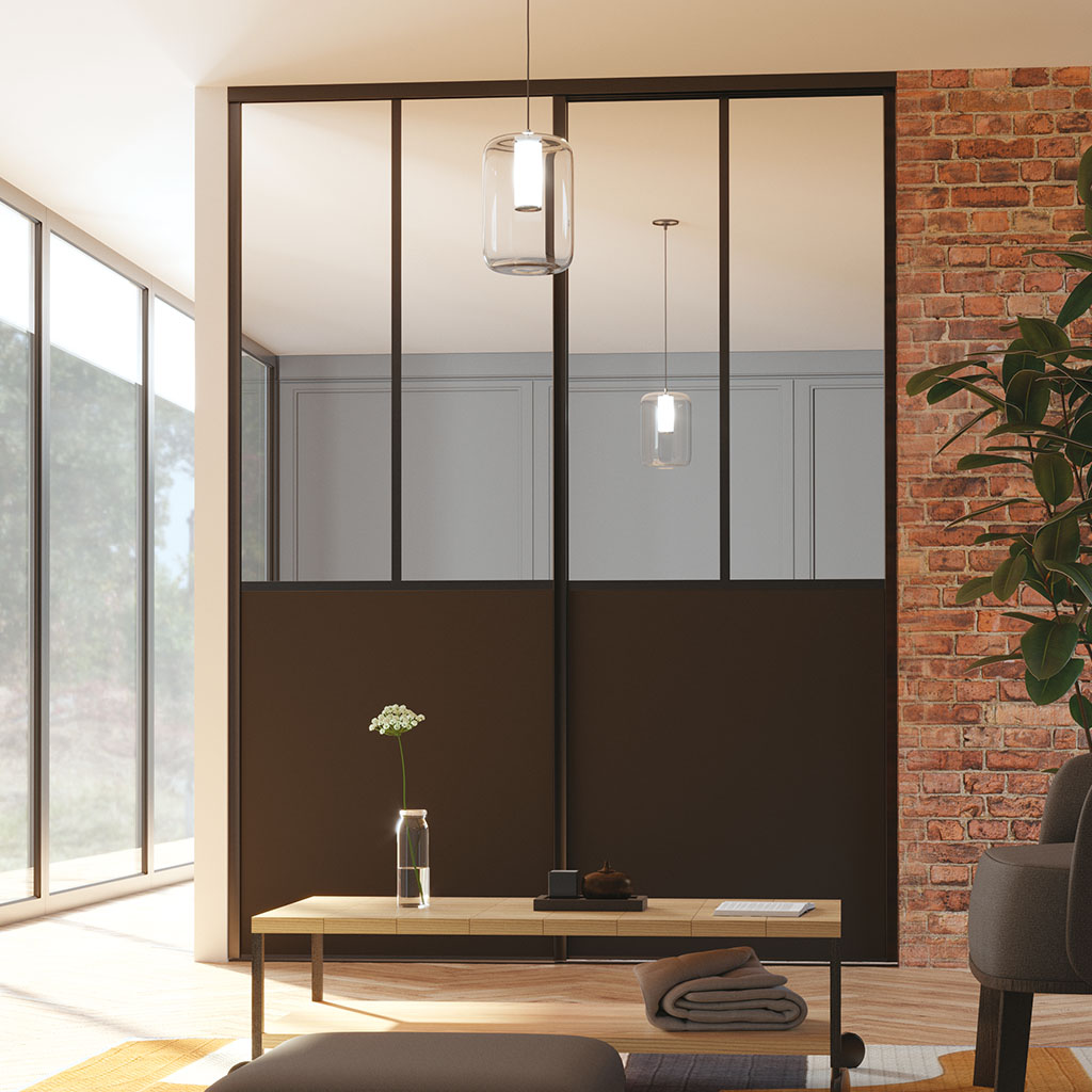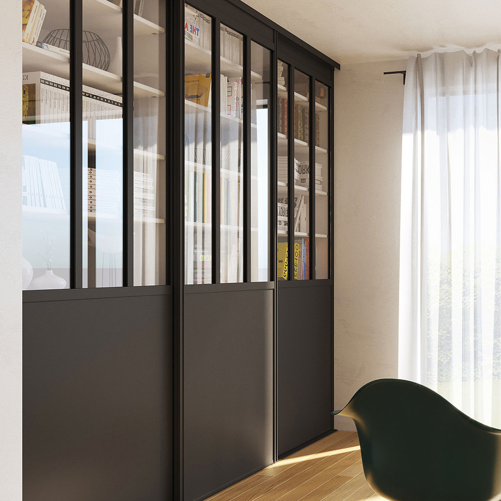 Cette solution originale apporte une touche industrielle à un intérieur sans espace à délimiter, un parti qui peut être renforcé avec son option tôle laquée. Cette porte coulissante atelier donne un aspect vitrine à un rangement ou peut venir compléter une composition de verrière