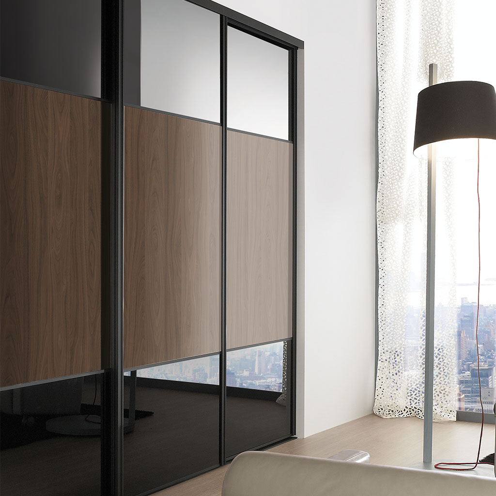Portes de placard coulissantes profil Platine noir, modèle sillage trio 1-1-1 vitre laquée noir et noyer lincoln – hauteur 3,10 m, largeur totale 2,20 m