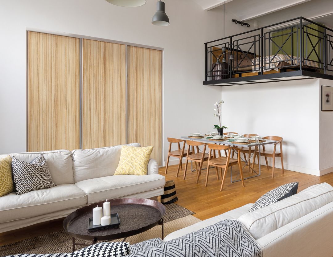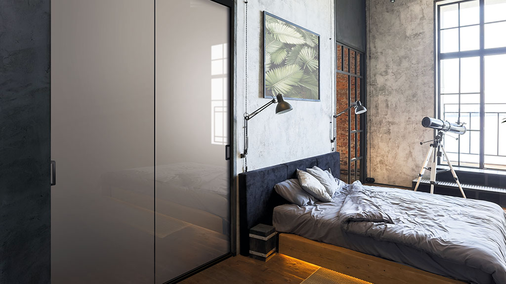 Avec son  mélange de miroir et de panneaux, la façade coulissante de placard prend des allures de verrières. Une alternative ingénieuse pour instiller une ambiance industrielle à une pièce.