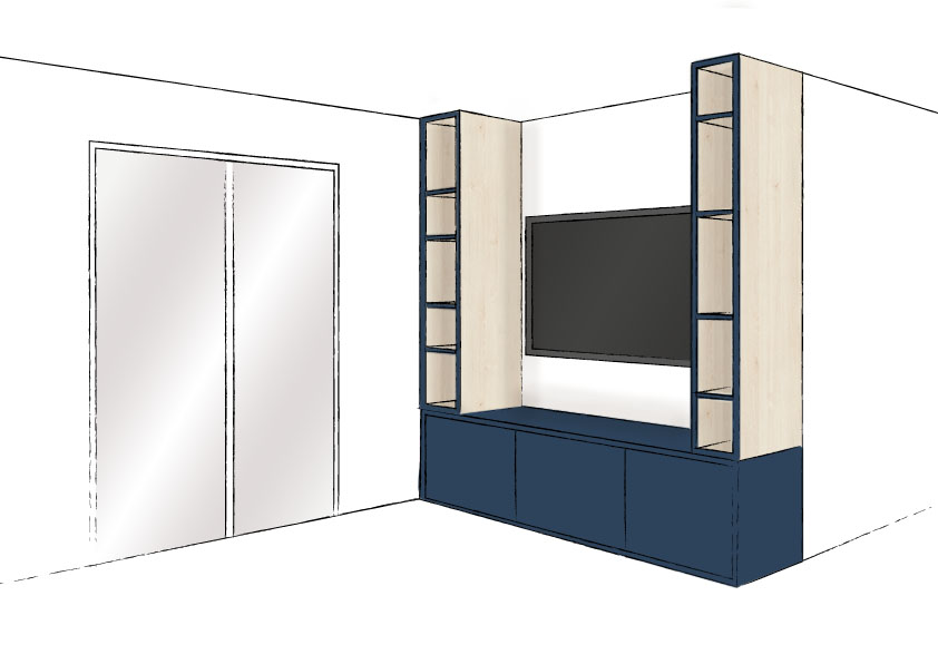 Un meuble télé en U avec des portes sur charnières battantes en partie basse. Décors bleu foncé et pin polaire, chants bleu foncé.