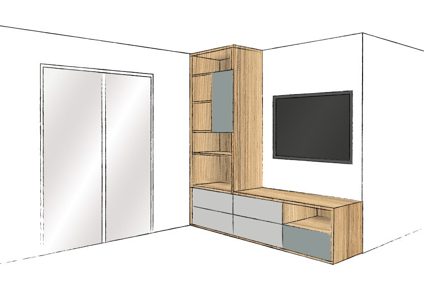 Un meuble télé en L avec des portes sur charnières battantes et tiroirs. Décors gris souris, fjord et coco bolo.