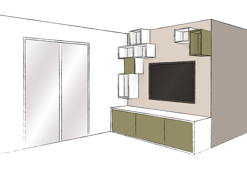 Un meuble télé destructuré avec des portes sur charnières battantes. Décors blanc et pistache.