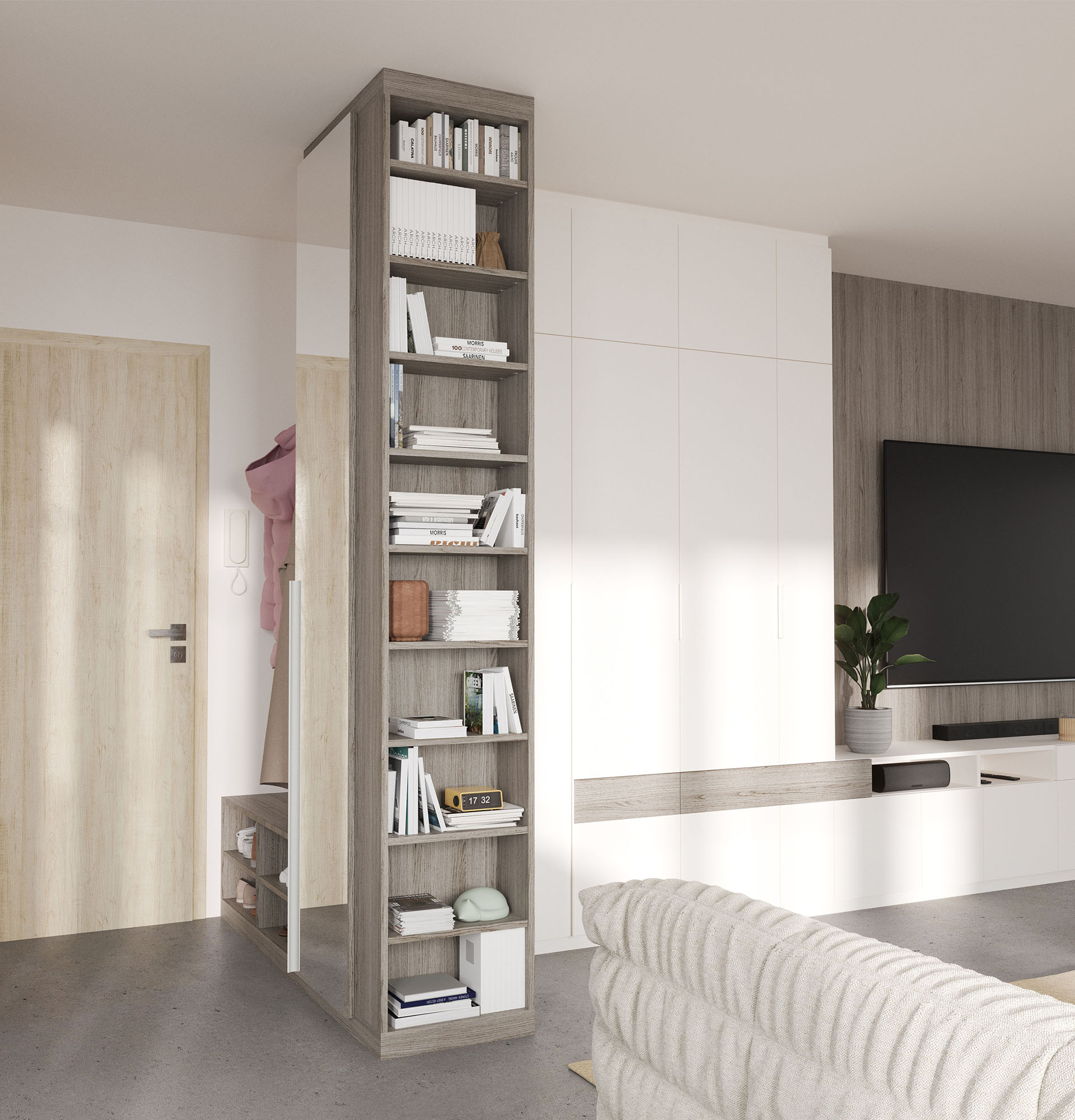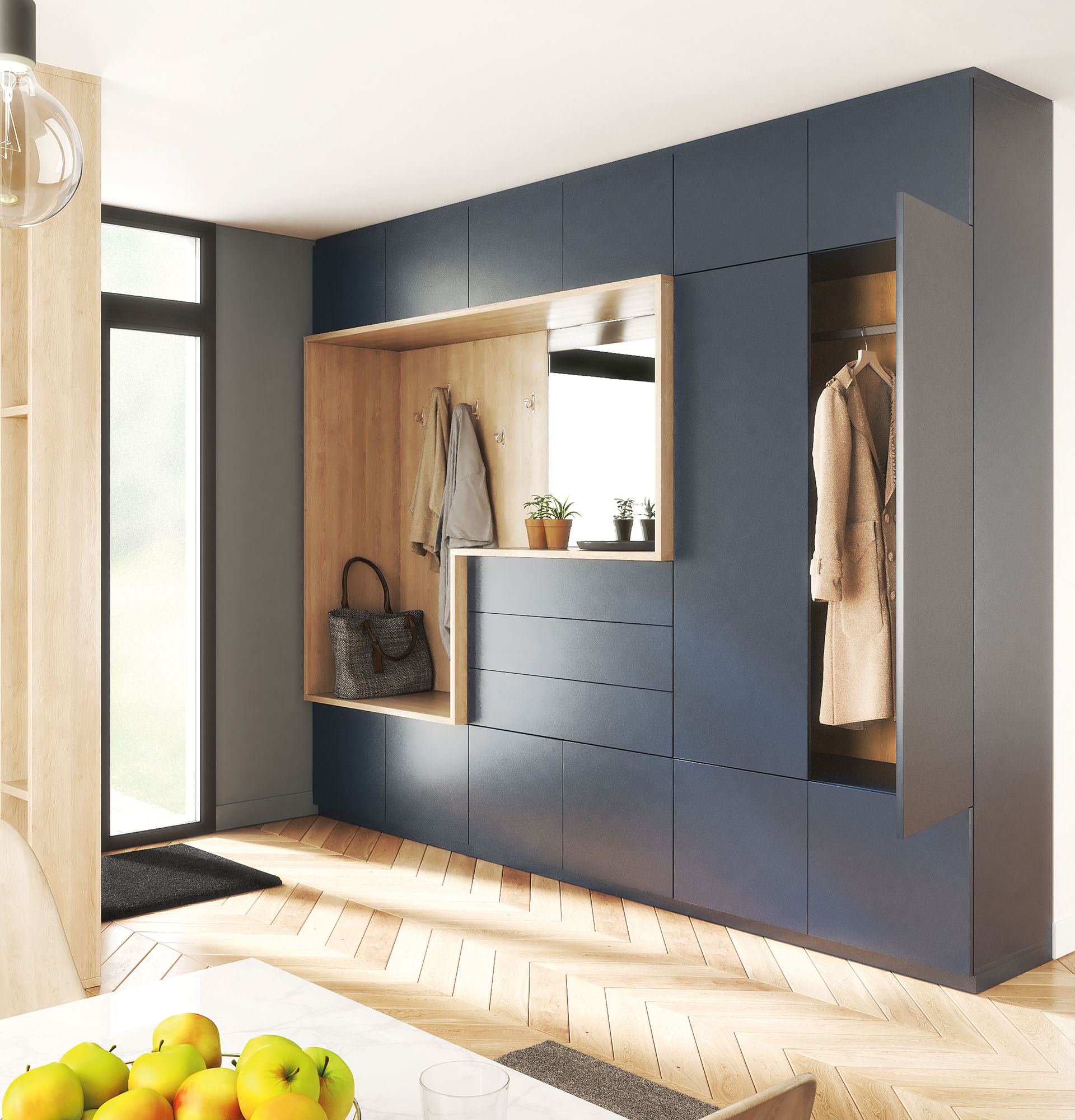 • Couloir / entrée : dans les espaces transitoires, le sur mesure se faufile dans les moindres recoins pour optimiser les possibilités de rangement sans empiéter sur le passage.