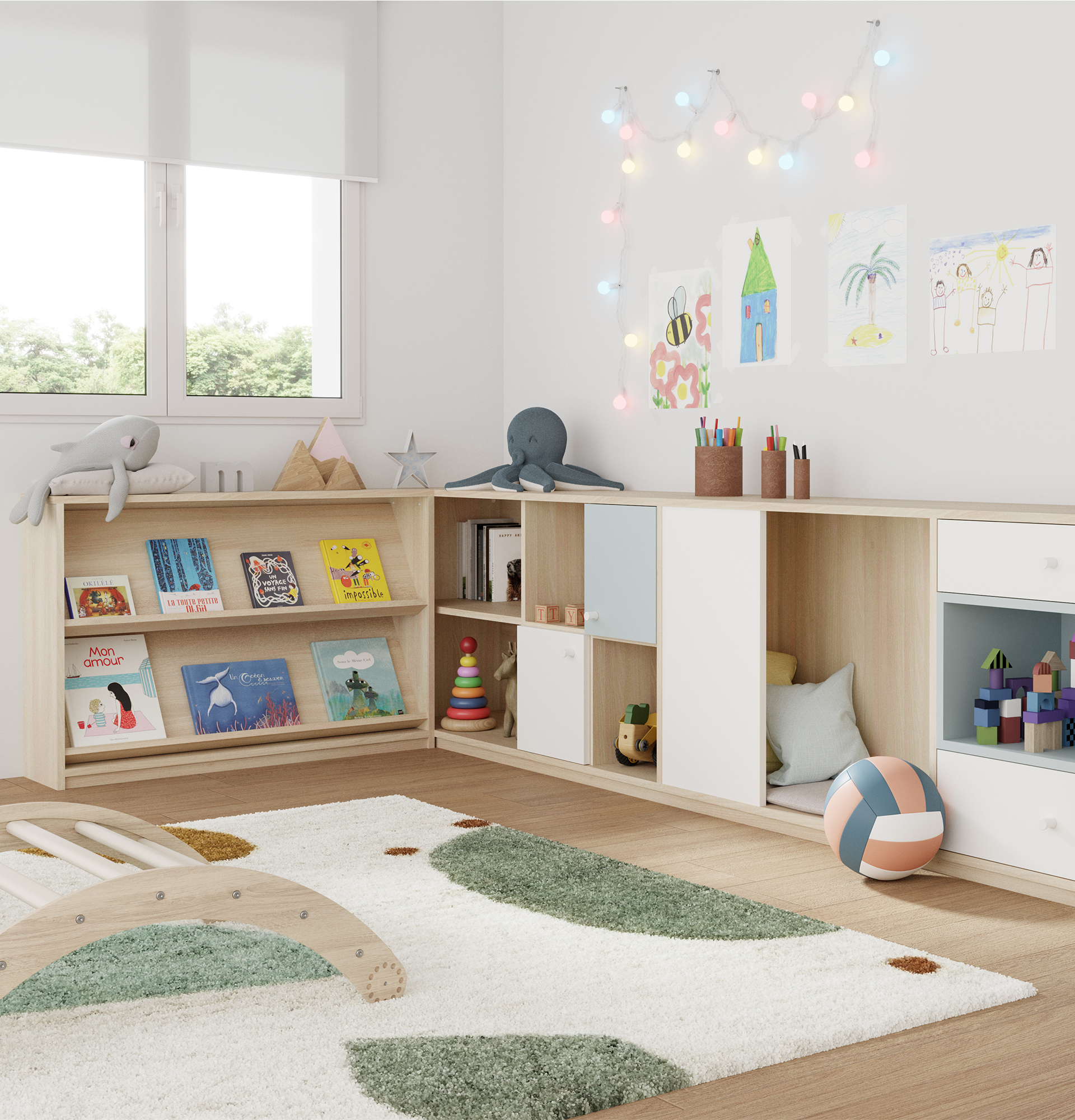 • Bureau : du placard à dossiers aux bloc-tiroirs, en passant par le plateau du bureau, il permet de créer un espace de travail adapté.