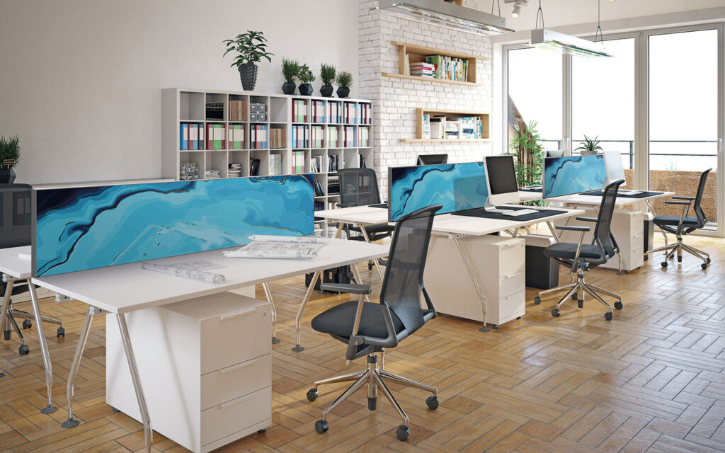 Pour délimiter les emplacements de travail de chacun, utiliser un séparateur de bureau est une solution efficace. Imago réinvente cet outil indispensable en lui apportant ses avantages incontournables. Enrichi d’une mousse acoustique, il va réduire les nuisances sonores et, grâce à sa toile interchangeable, chaque utilisateur va pouvoir choisir un décor à sa convenance.