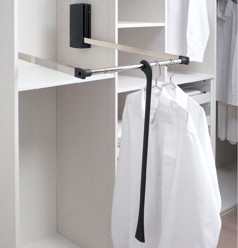 Il existe également une penderie télescopique qui permet d’optimiser la partie haute du dressing. Il suffit alors de faire descendre la barre et son contenu à votre hauteur grâce à une poignée. Pratique et épatant !