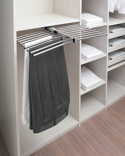 Pour les pantalons qui se froissent, un porte-pantalons permet de les conserver sans leur créer de plis supplémentaires. Cet accessoire coulisse afin d’accéder aux pantalons les plus en retrait.