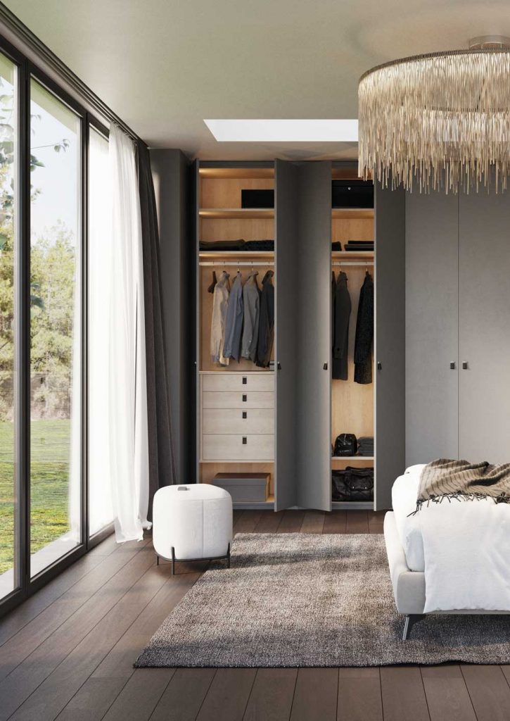 Mettre une porte à son dressing va permettre de protéger vos vêtements de la poussière et de la lumière. En fermant le dressing, elle contribue aussi à créer un espace visuel minimaliste. Cependant les portes nécessitent de l’espace pour être manipulées.