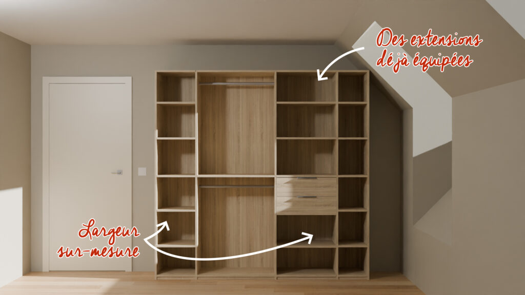Les extensions du dressing sont choisies une à une selon vos besoins. Chacune fait la largeur de votre choix.