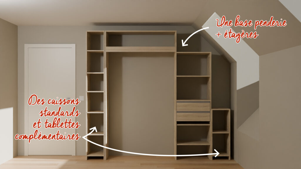 Cette solution standardisée se compose d’une penderie et d’une colonne avec des tablettes. Ici, on la complète par deux caissons. Ainsi la surface de rangement est plus grande en essayant de s’adapter à l’espace.